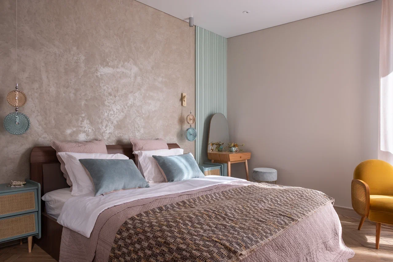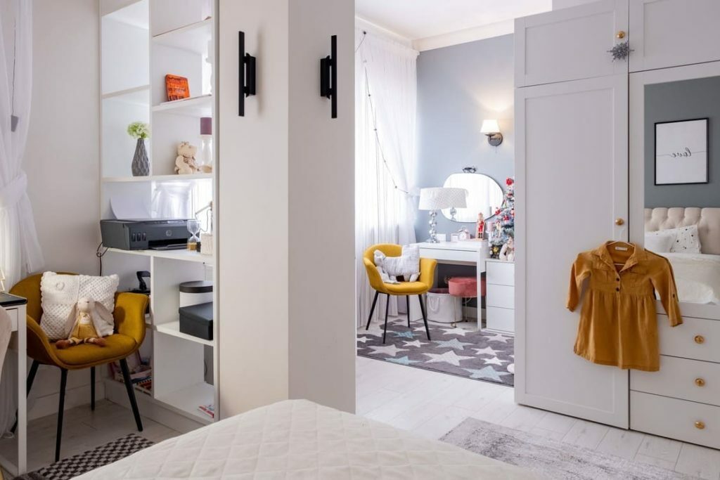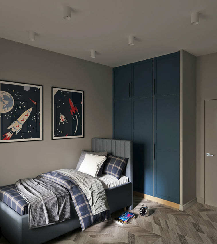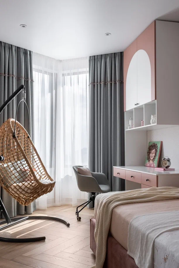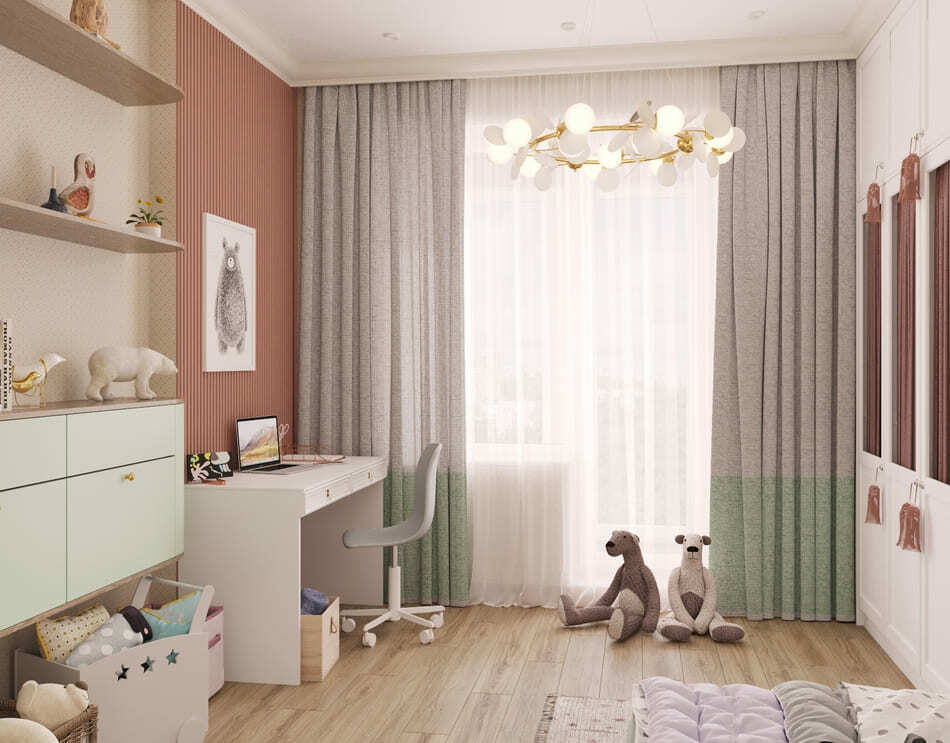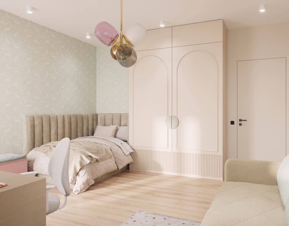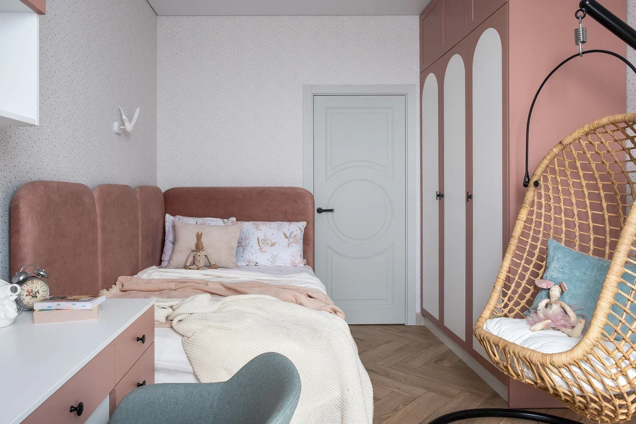 В мастер спальне помимо кровати расположился большой функциональный шкаф и туалетный столик у окна. Детская комната для прекрасной маленькой дочки также включает в себя несколько зон, что позволяет удобно как играть и учиться, так и расположить друзей. Скрытые двери намекают на минималистичный интерьер, но цветовые акценты, стильные принты и детали устраняют намёк на скуку.