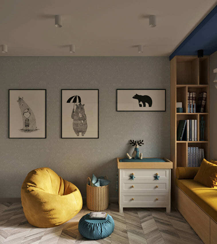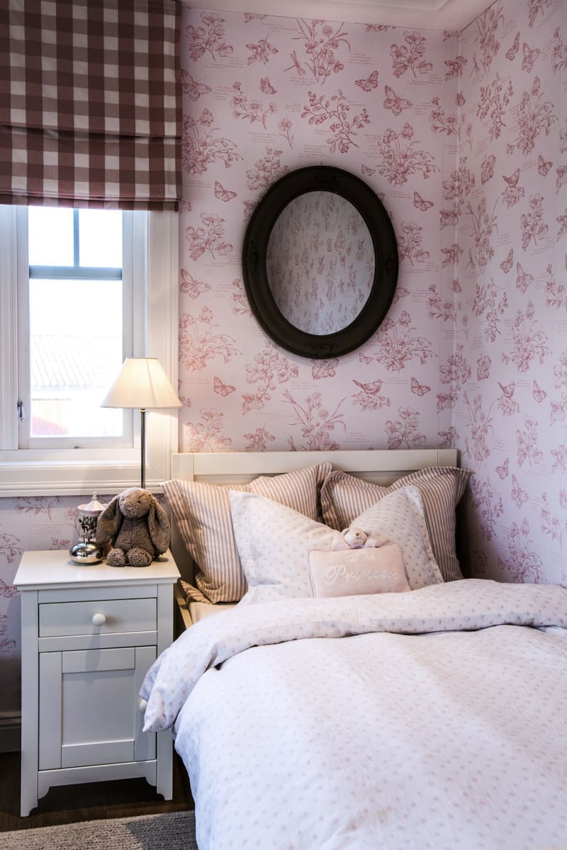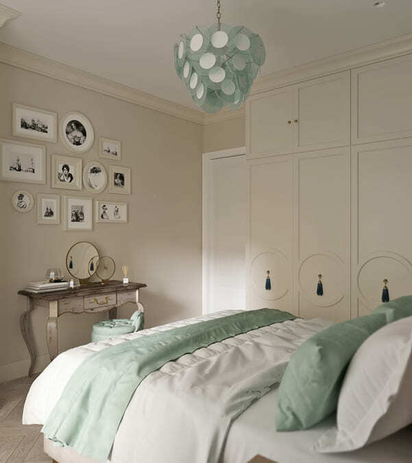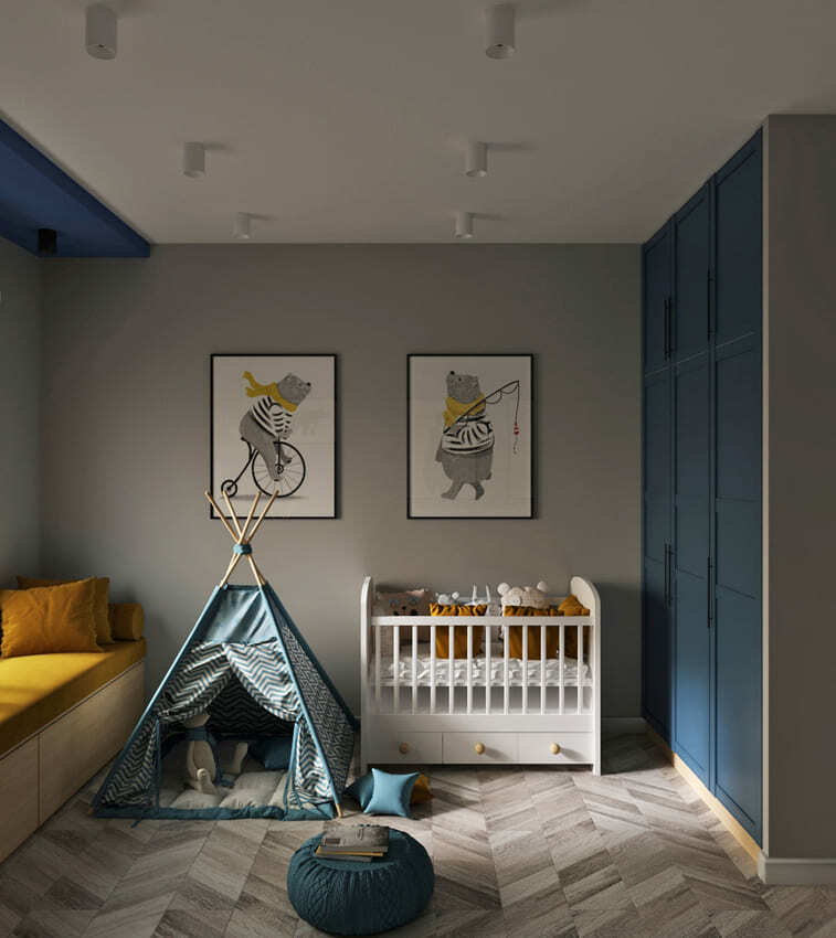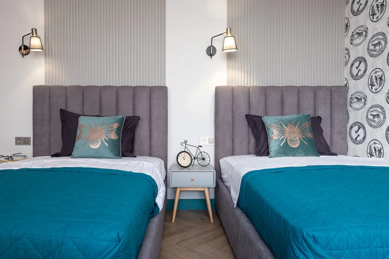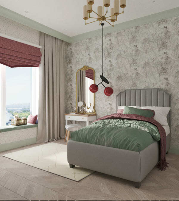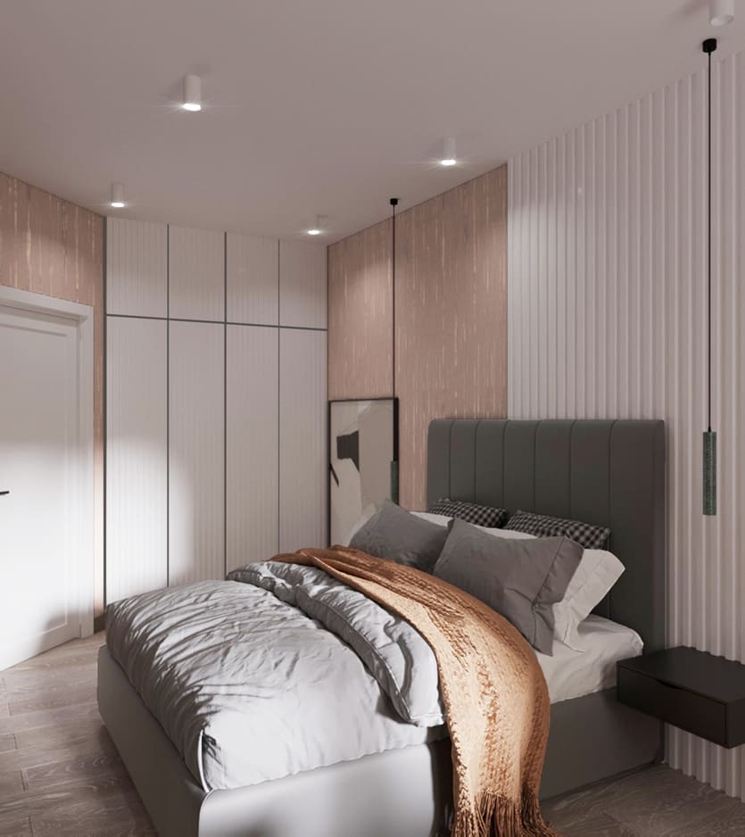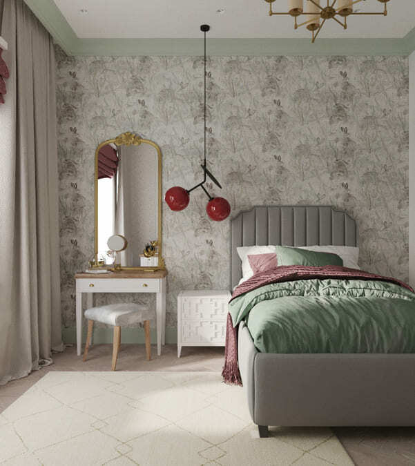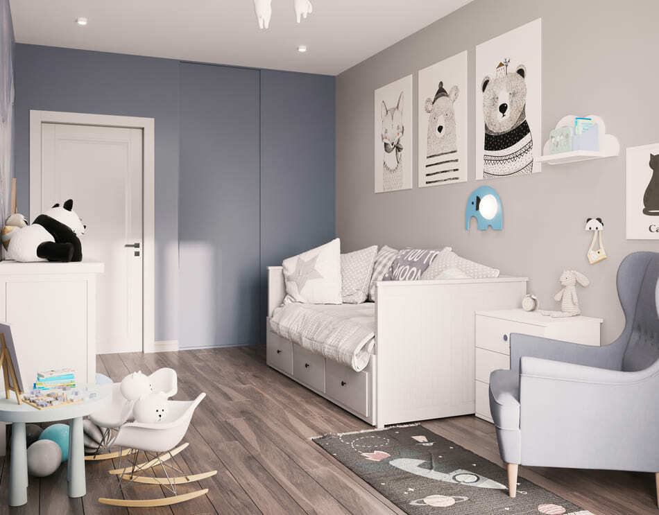 В мастер спальне помимо кровати расположился большой функциональный шкаф и туалетный столик у окна. Детская комната для прекрасной маленькой дочки также включает в себя несколько зон, что позволяет удобно как играть и учиться, так и расположить друзей. Скрытые двери намекают на минималистичный интерьер, но цветовые акценты, стильные принты и детали устраняют намёк на скуку.