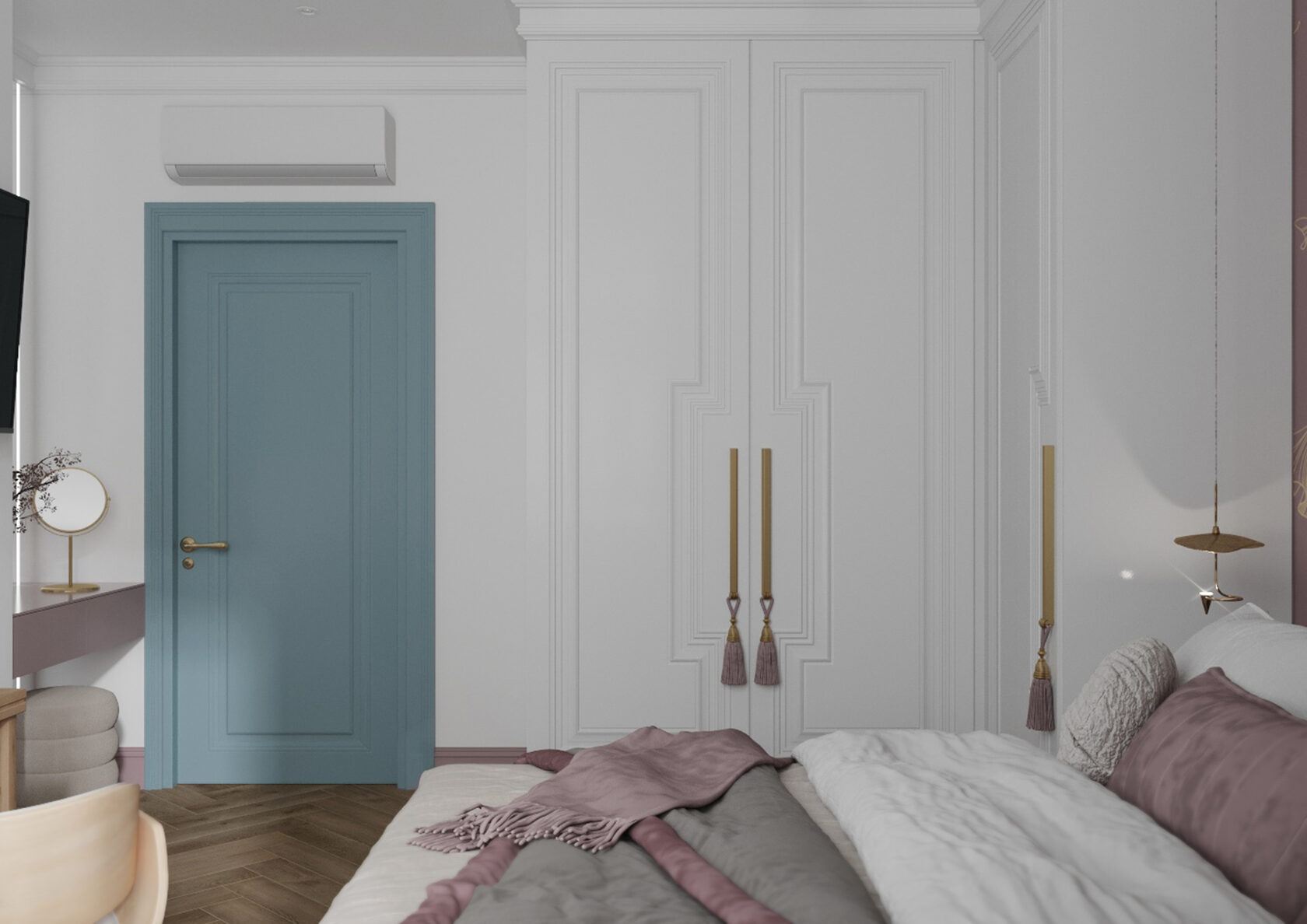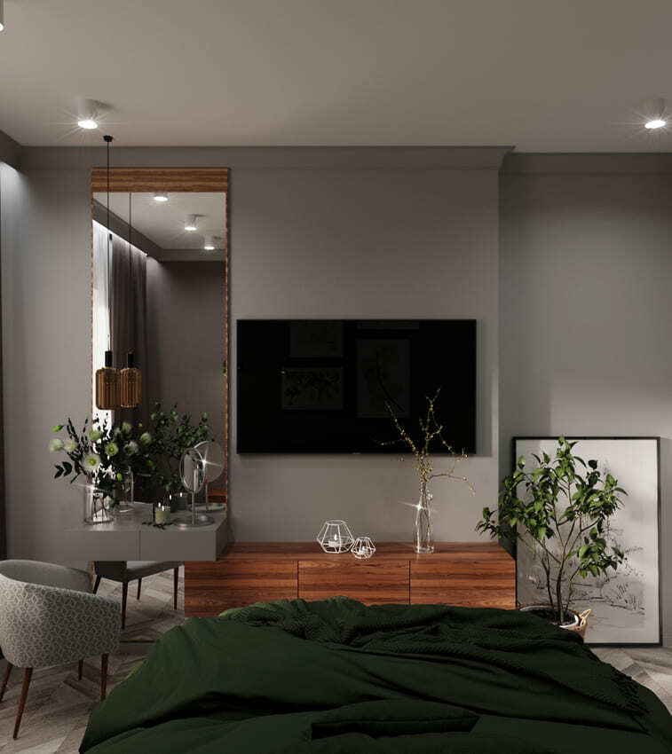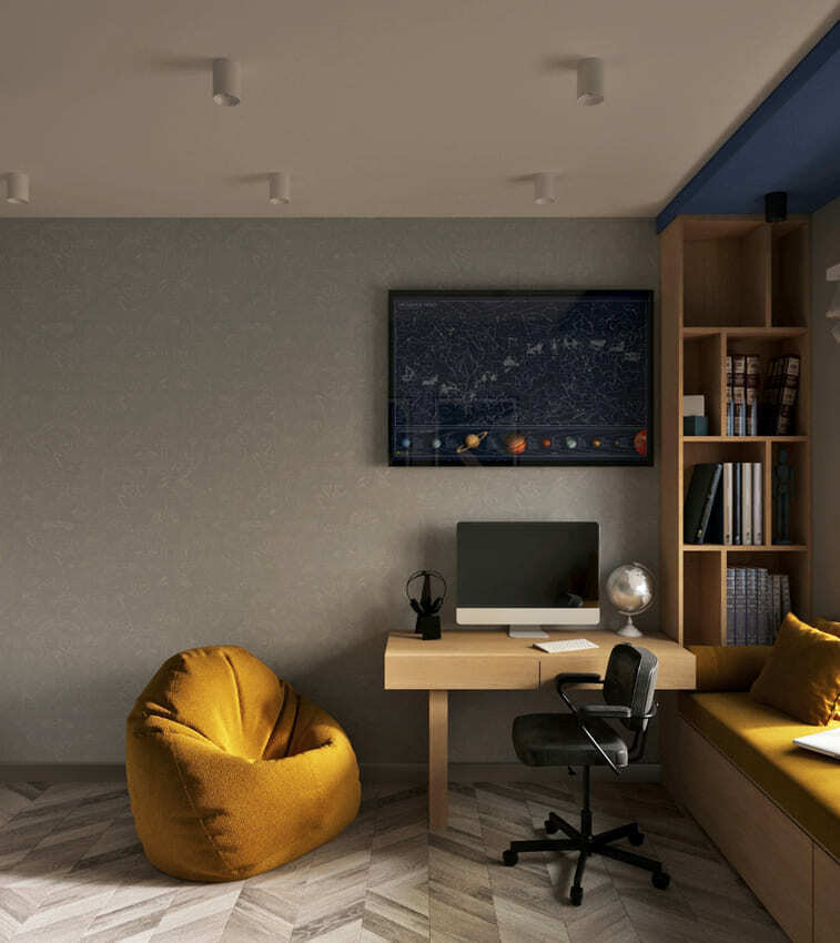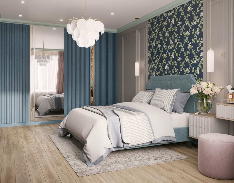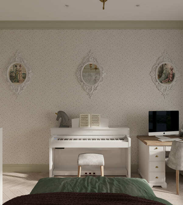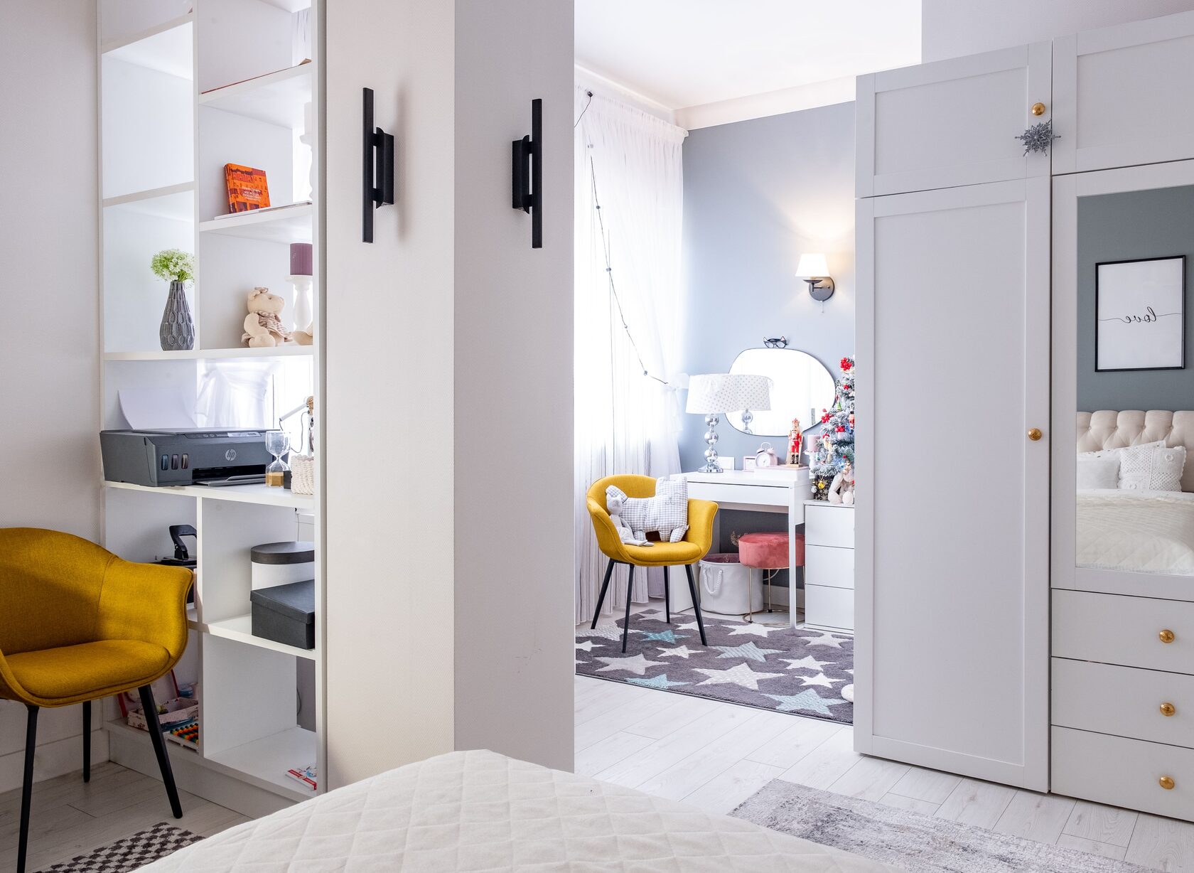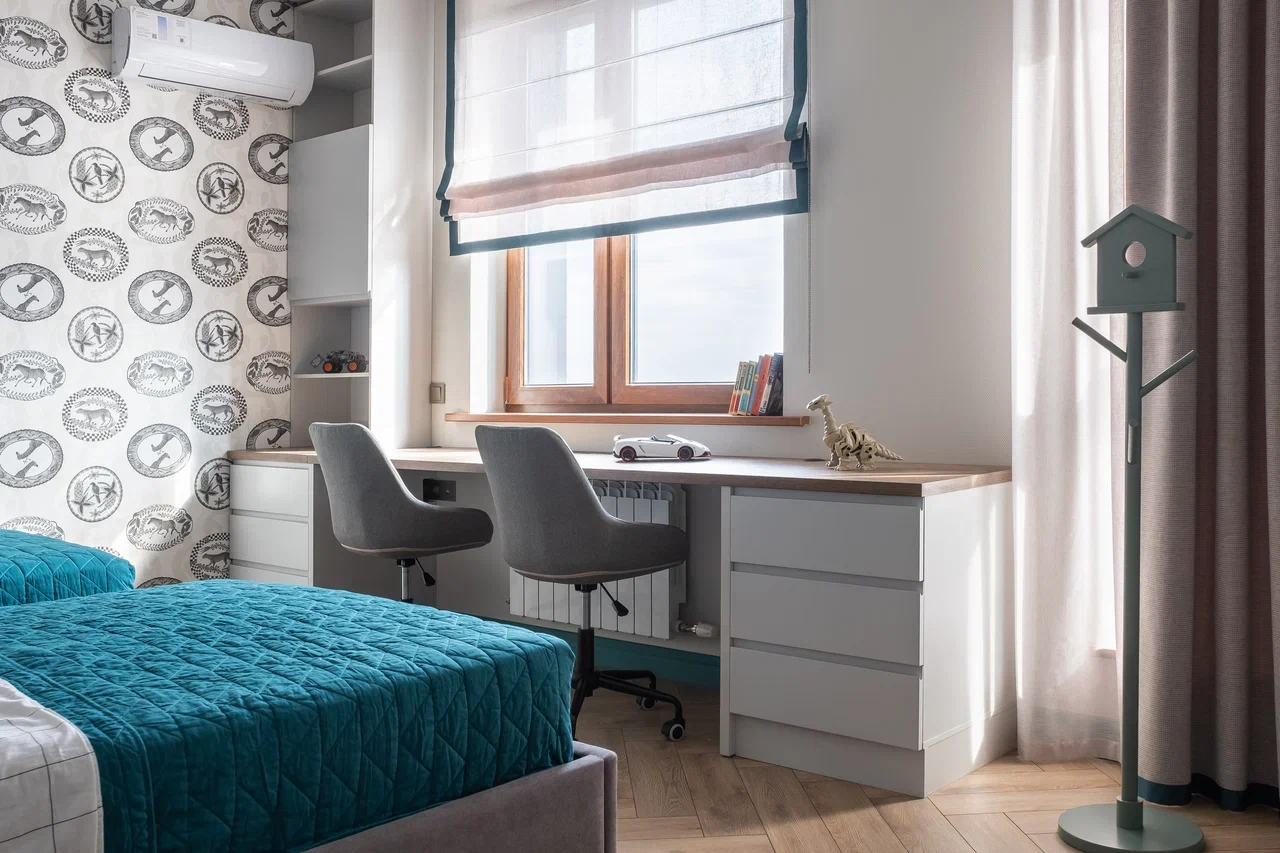 В мастер спальне помимо кровати расположился большой функциональный шкаф и туалетный столик у окна. Детская комната для прекрасной маленькой дочки также включает в себя несколько зон, что позволяет удобно как играть и учиться, так и расположить друзей. Скрытые двери намекают на минималистичный интерьер, но цветовые акценты, стильные принты и детали устраняют намёк на скуку.