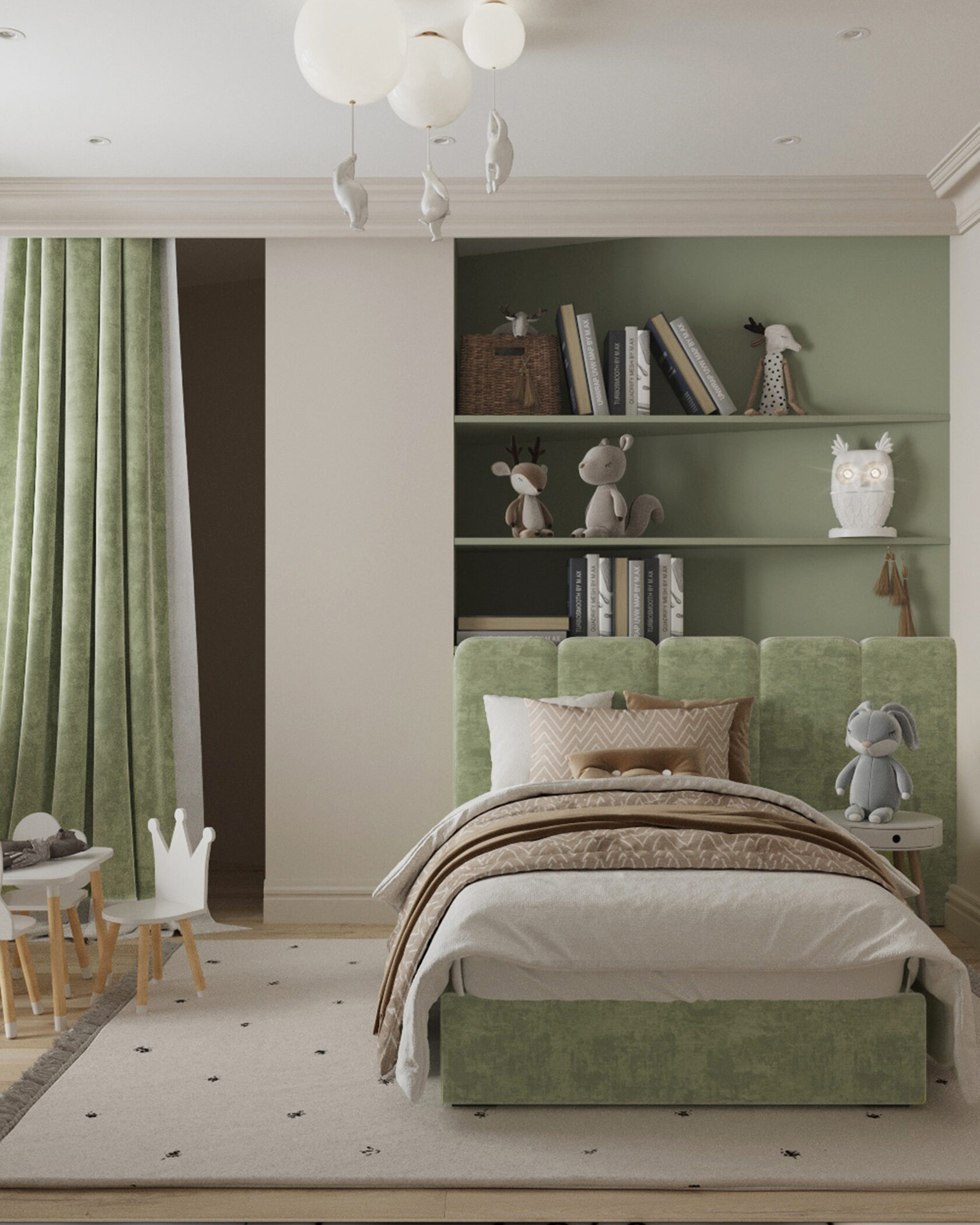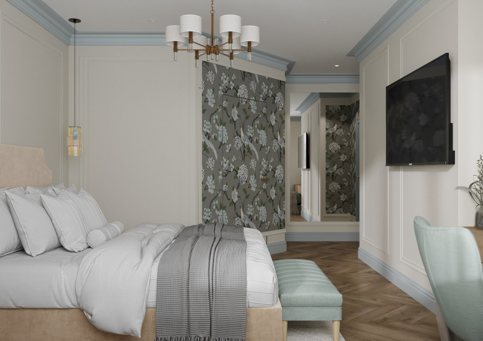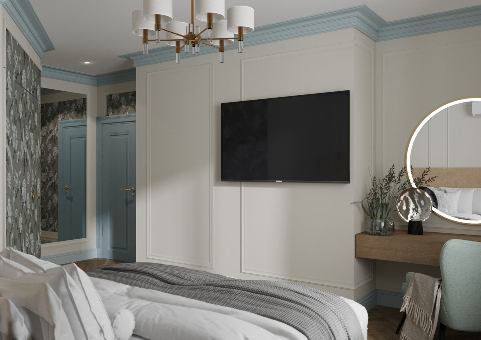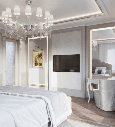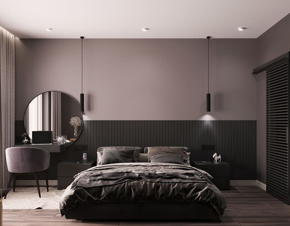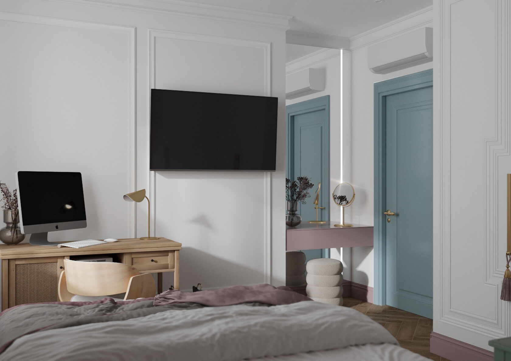 В мастер спальне помимо кровати расположился большой функциональный шкаф и туалетный столик у окна. Детская комната для прекрасной маленькой дочки также включает в себя несколько зон, что позволяет удобно как играть и учиться, так и расположить друзей. Скрытые двери намекают на минималистичный интерьер, но цветовые акценты, стильные принты и детали устраняют намёк на скуку.