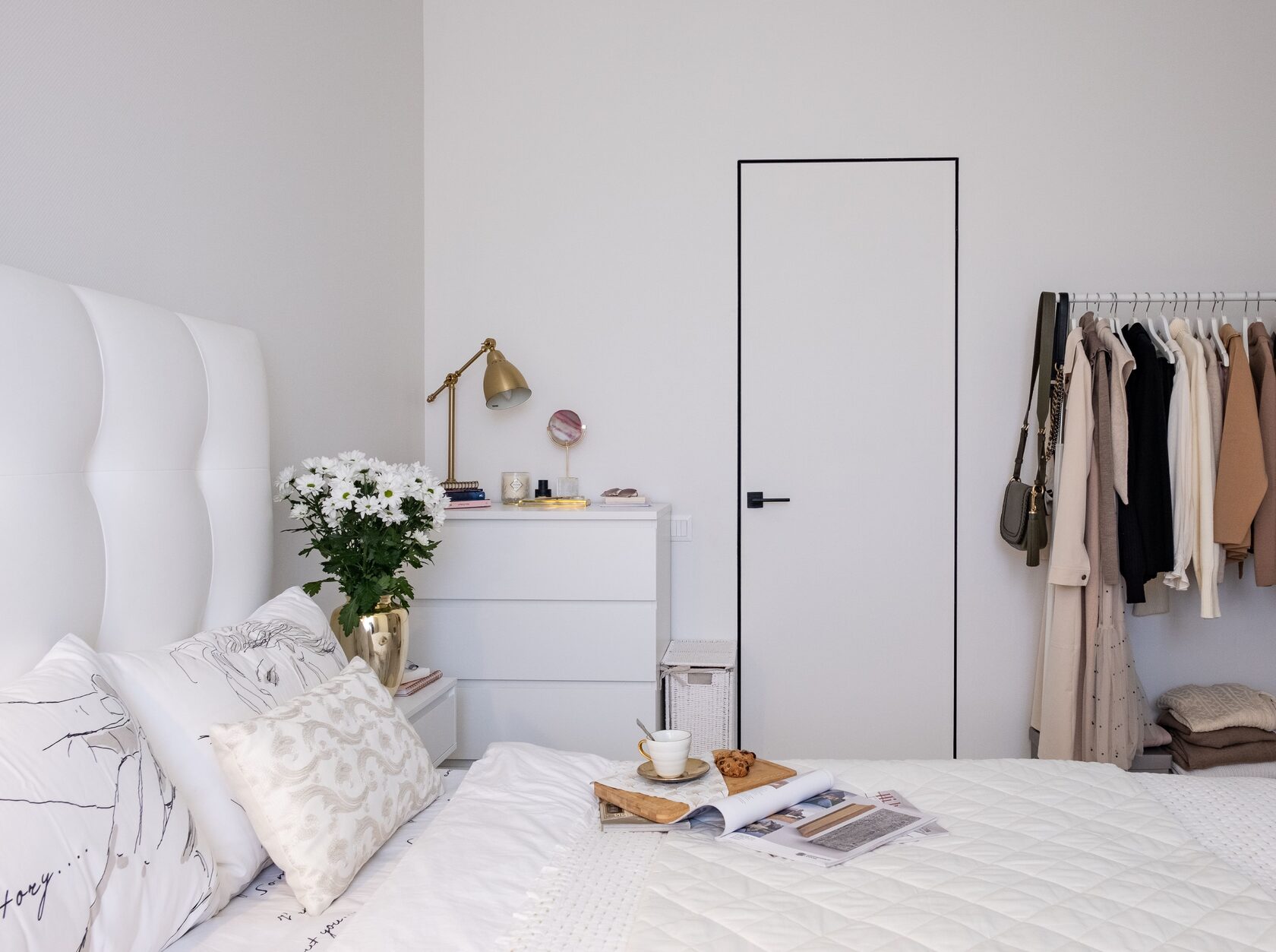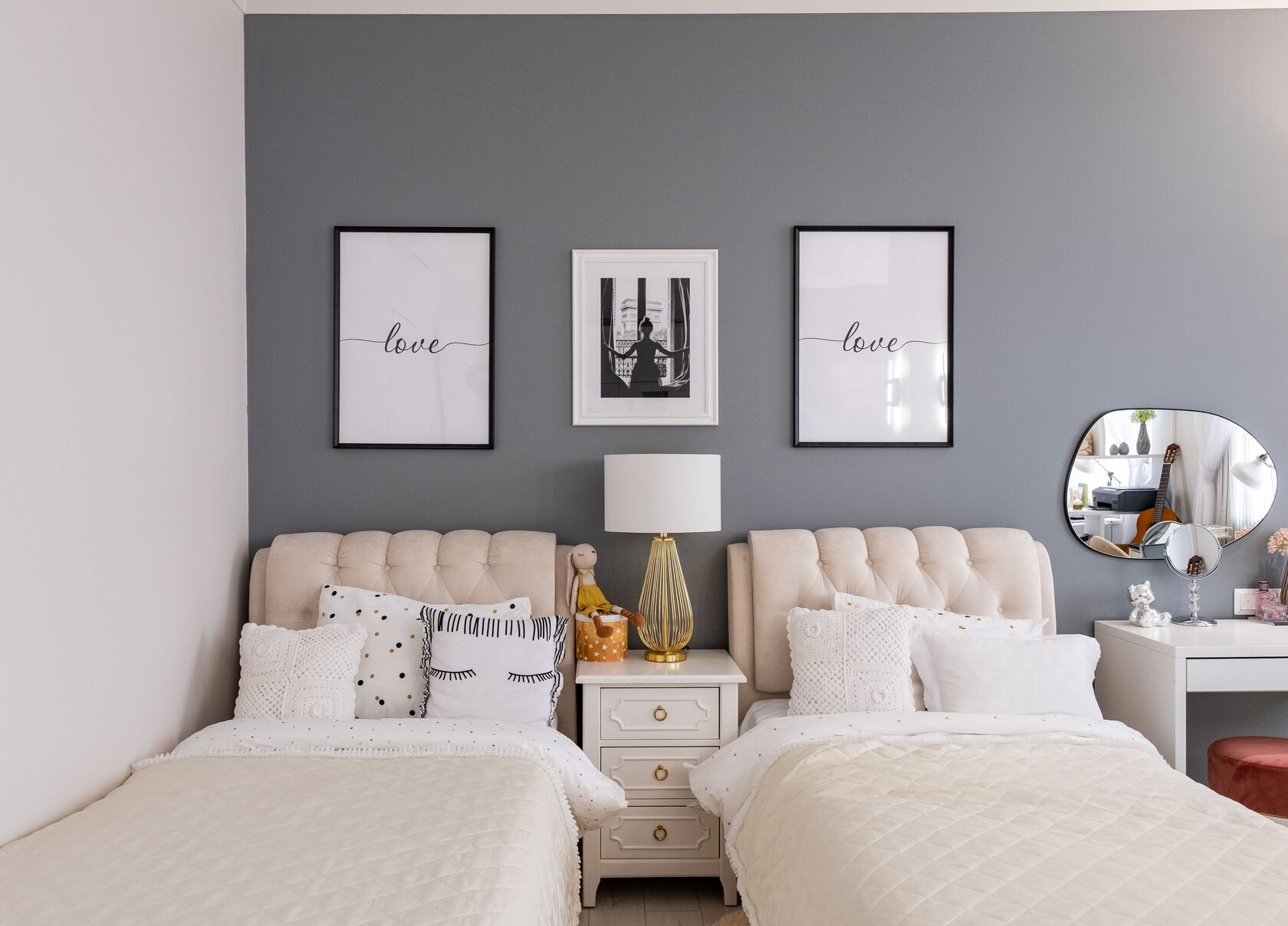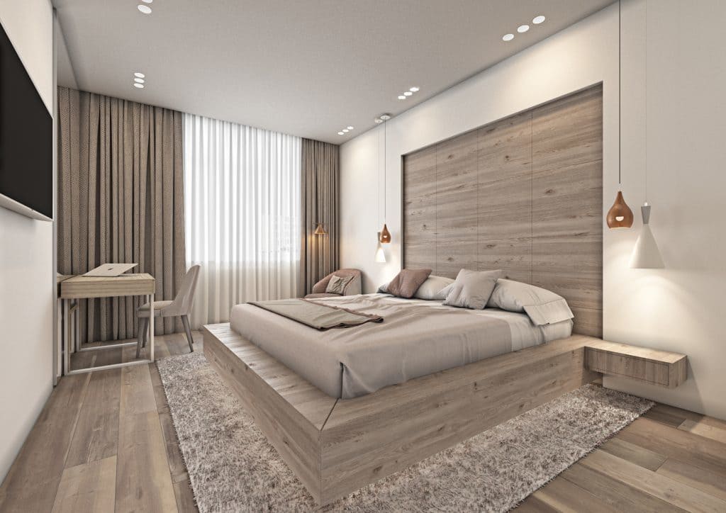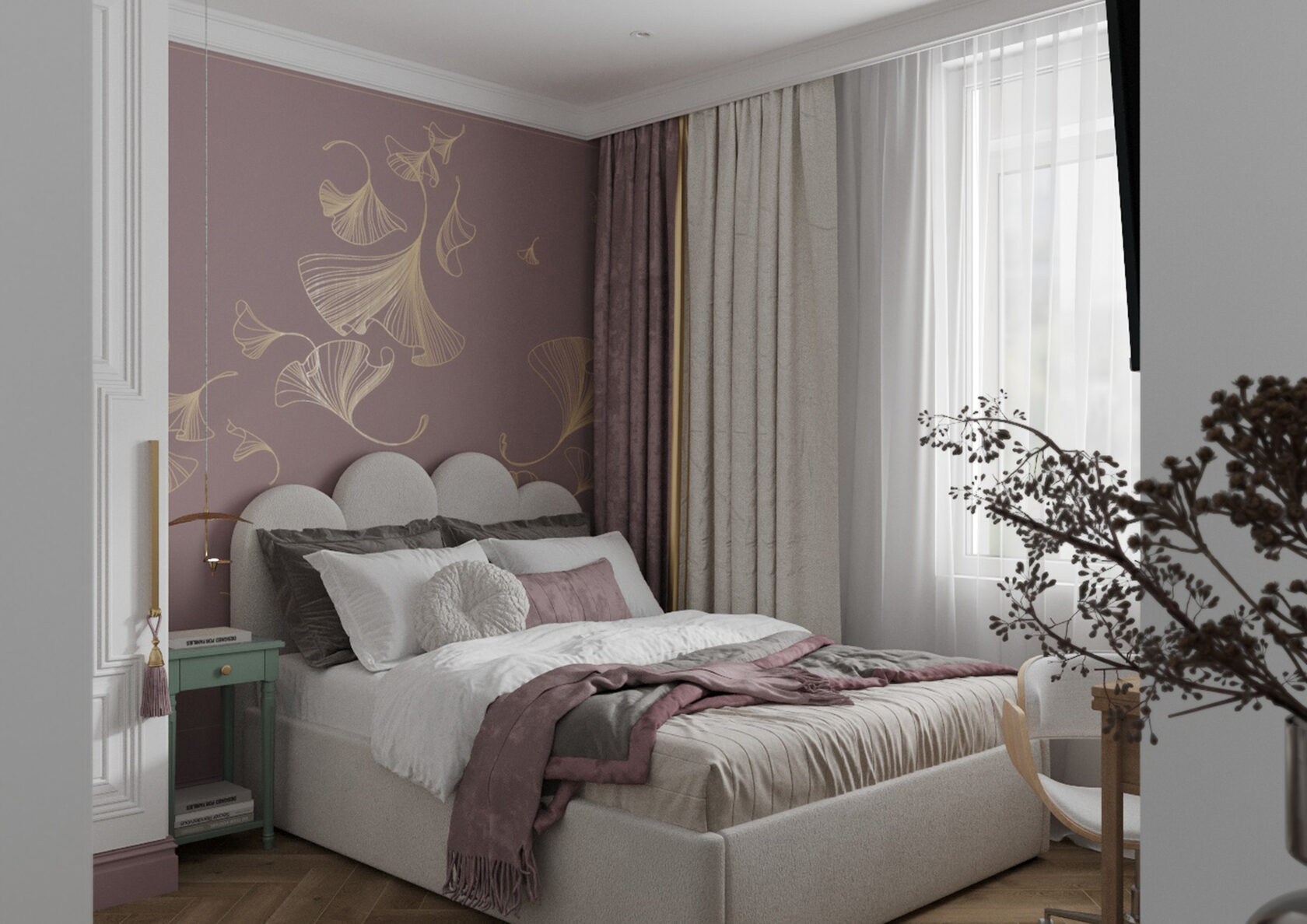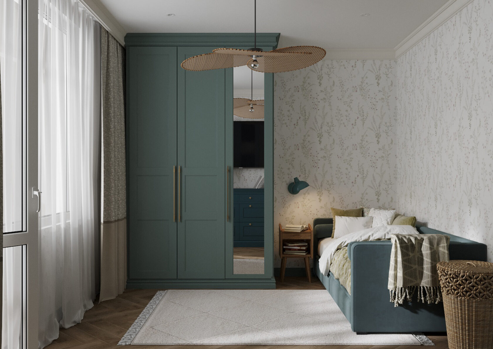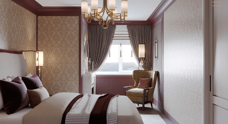 В мастер спальне помимо кровати расположился большой функциональный шкаф и туалетный столик у окна. Детская комната для прекрасной маленькой дочки также включает в себя несколько зон, что позволяет удобно как играть и учиться, так и расположить друзей. Скрытые двери намекают на минималистичный интерьер, но цветовые акценты, стильные принты и детали устраняют намёк на скуку.