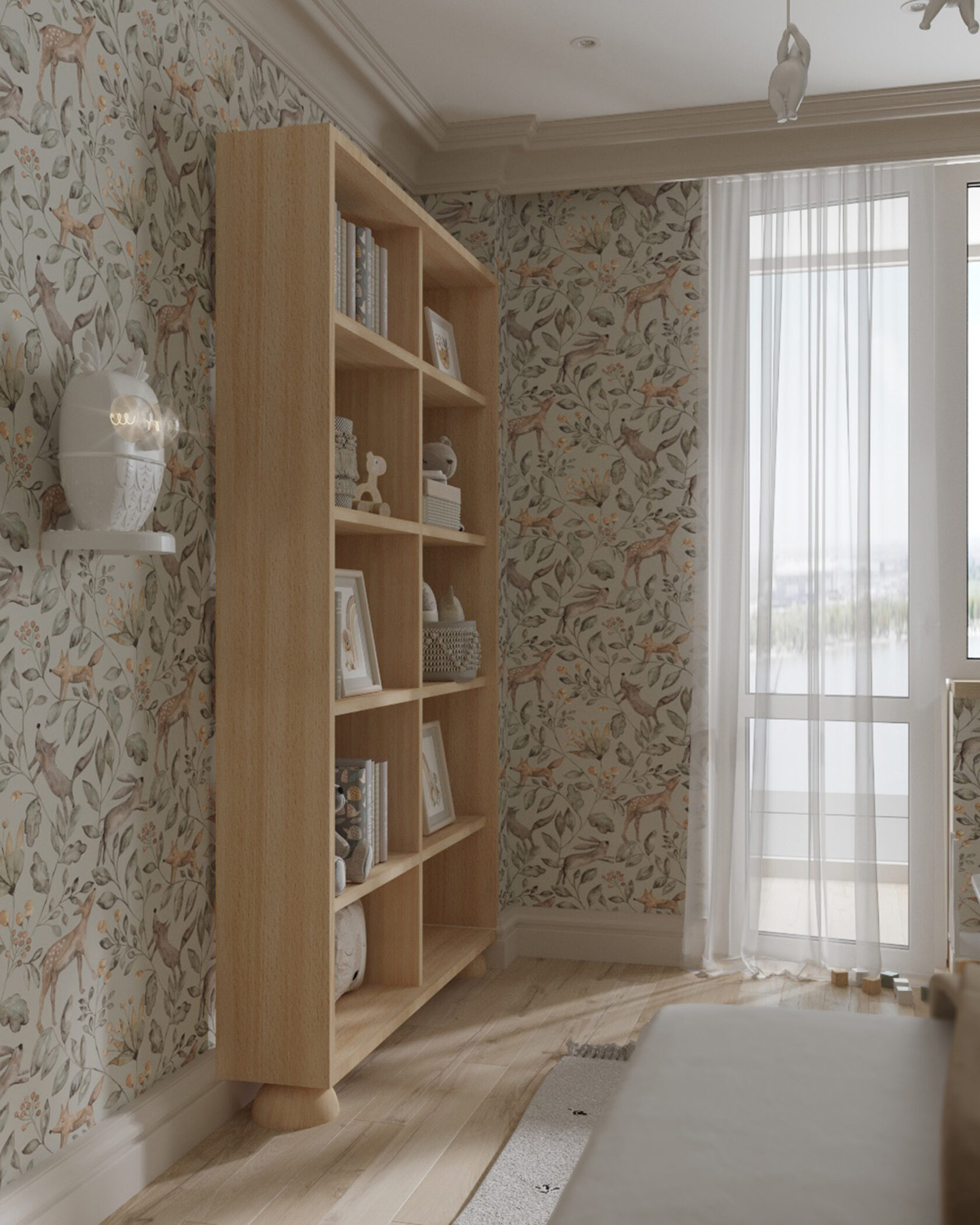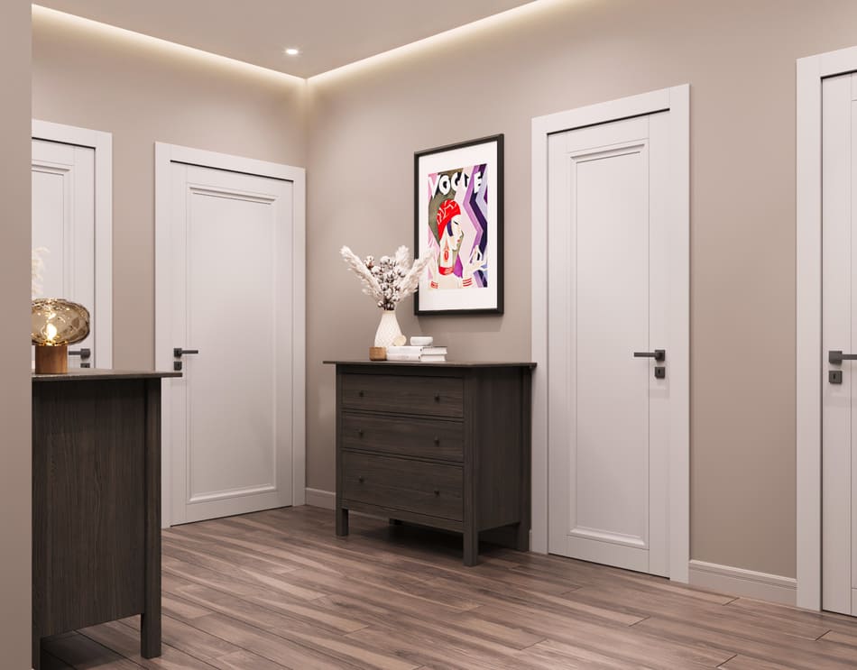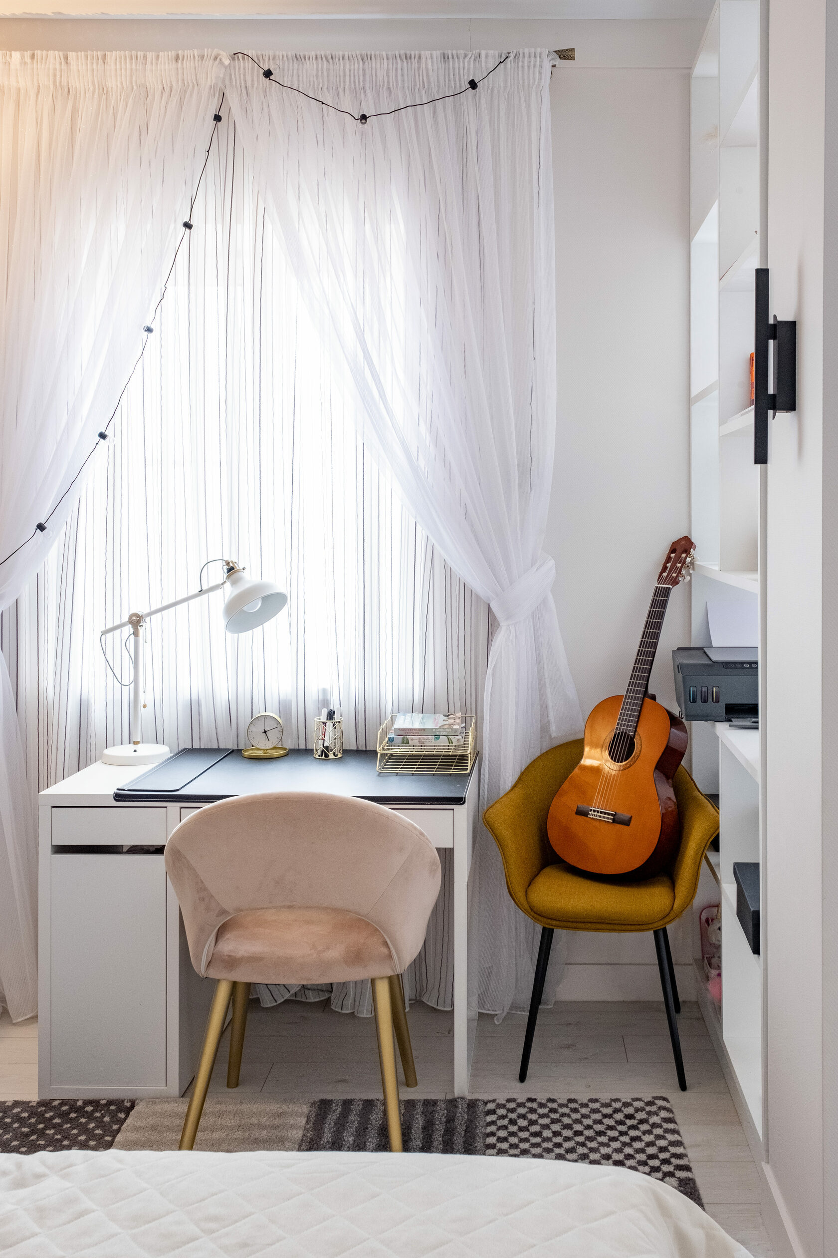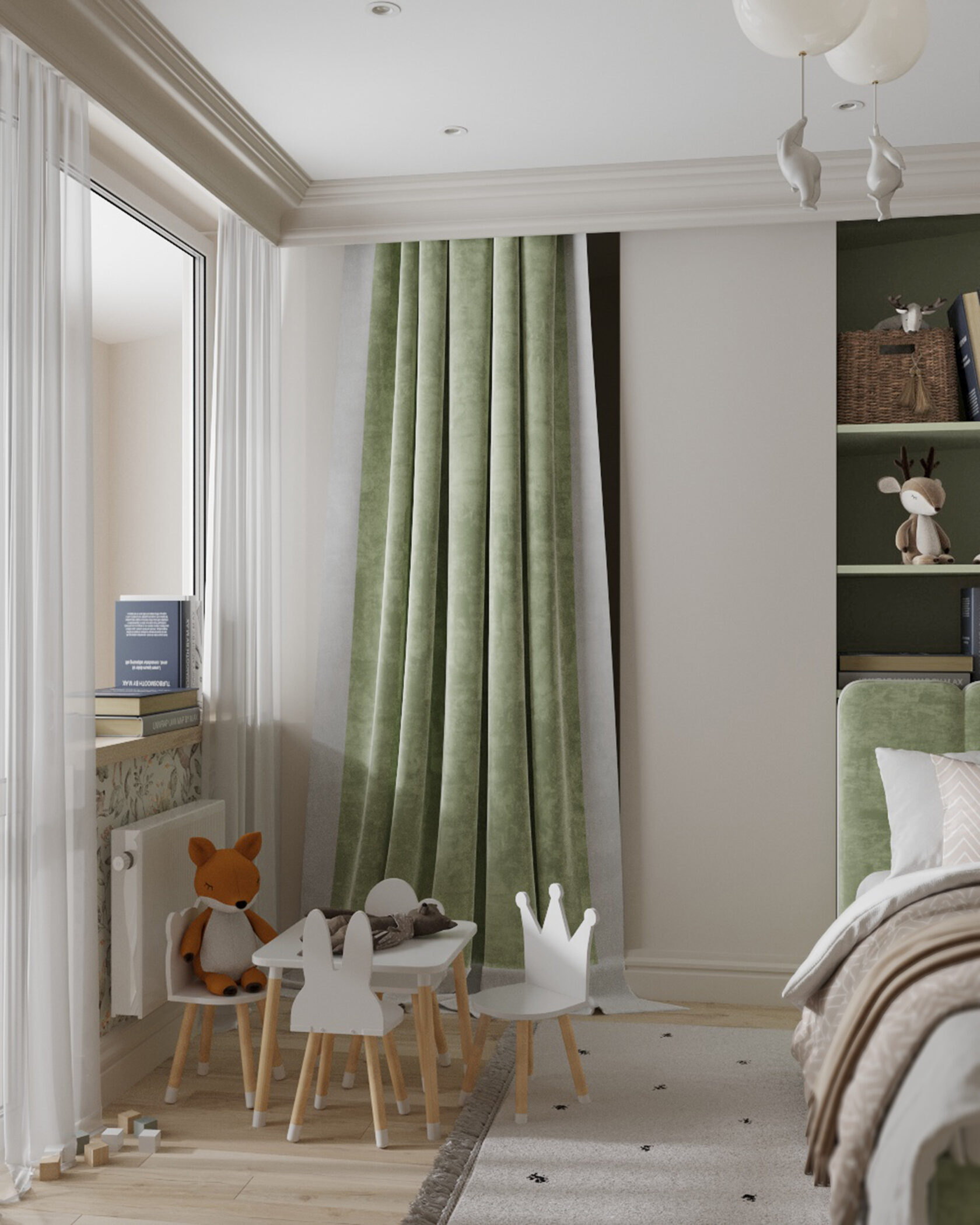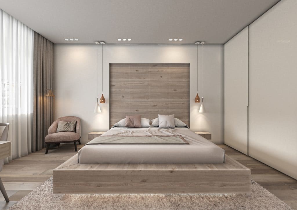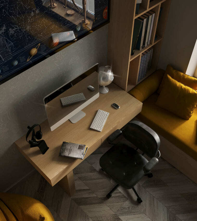 В мастер спальне помимо кровати расположился большой функциональный шкаф и туалетный столик у окна. Детская комната для прекрасной маленькой дочки также включает в себя несколько зон, что позволяет удобно как играть и учиться, так и расположить друзей. Скрытые двери намекают на минималистичный интерьер, но цветовые акценты, стильные принты и детали устраняют намёк на скуку.