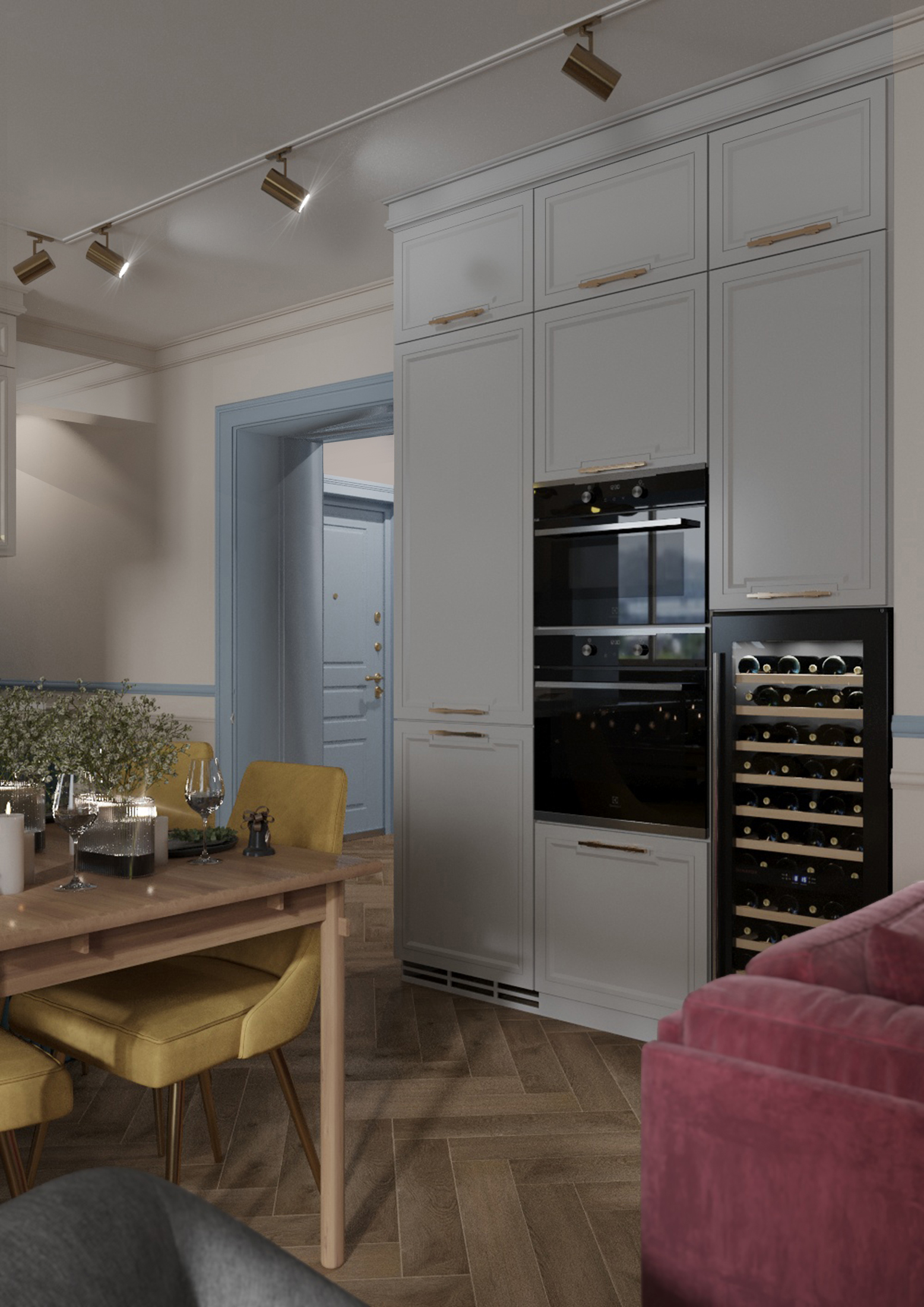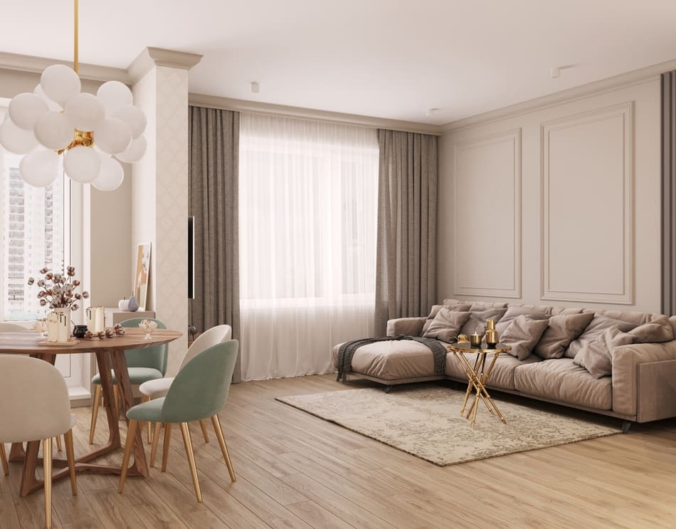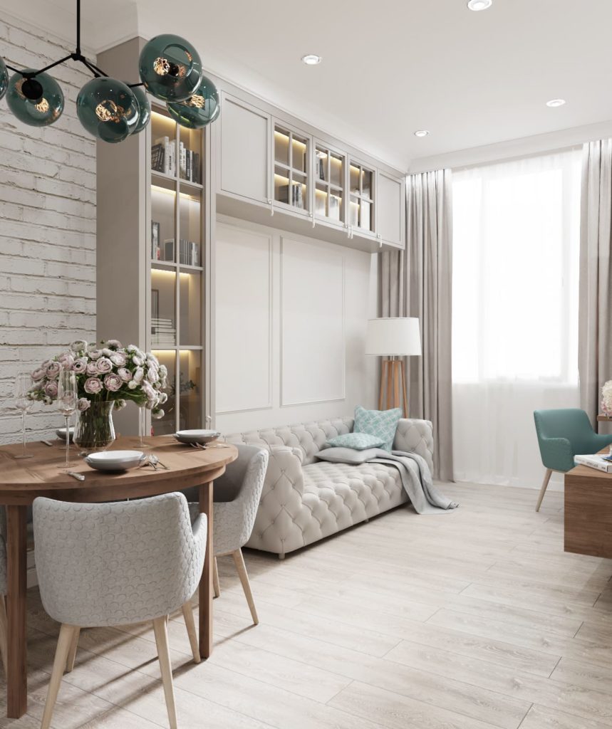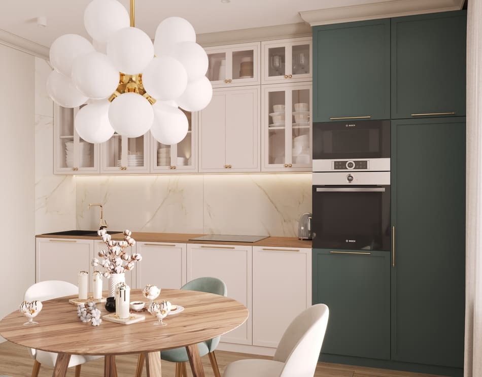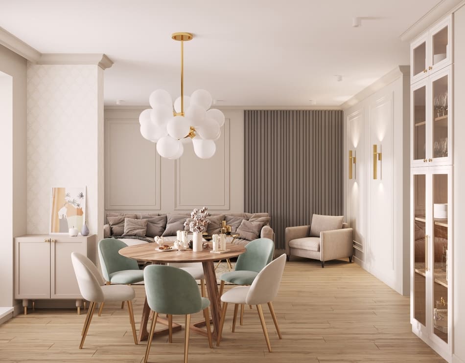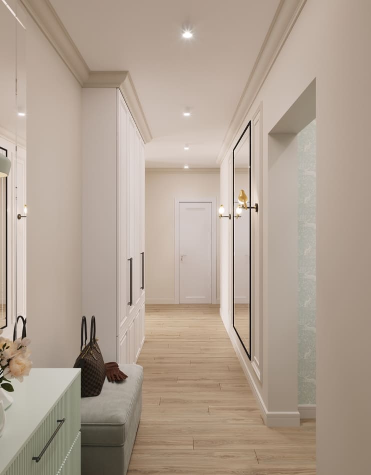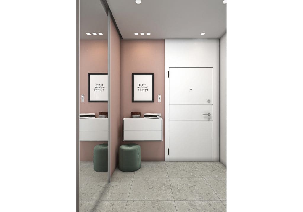 Также, мы использовали любимые цвета будущих хозяев: розовый для хозяйки, и зеленый для хозяина. В пастельных тонах эти цвета отлично сочетаются и не надоедают. В сочетании с теплыми бежевыми оттенками, квартира остается очень уютной.