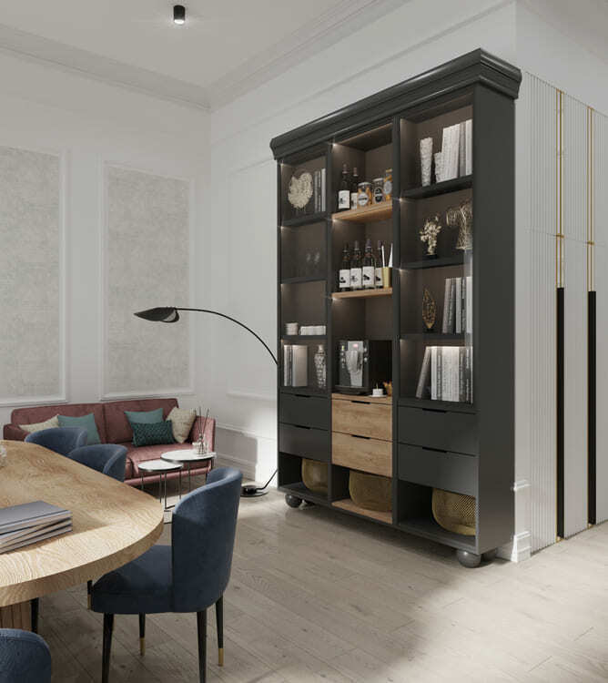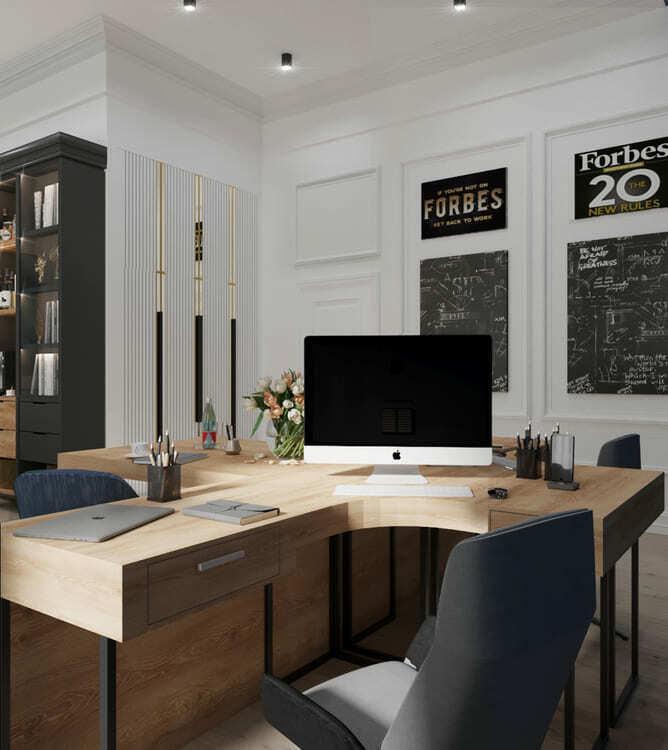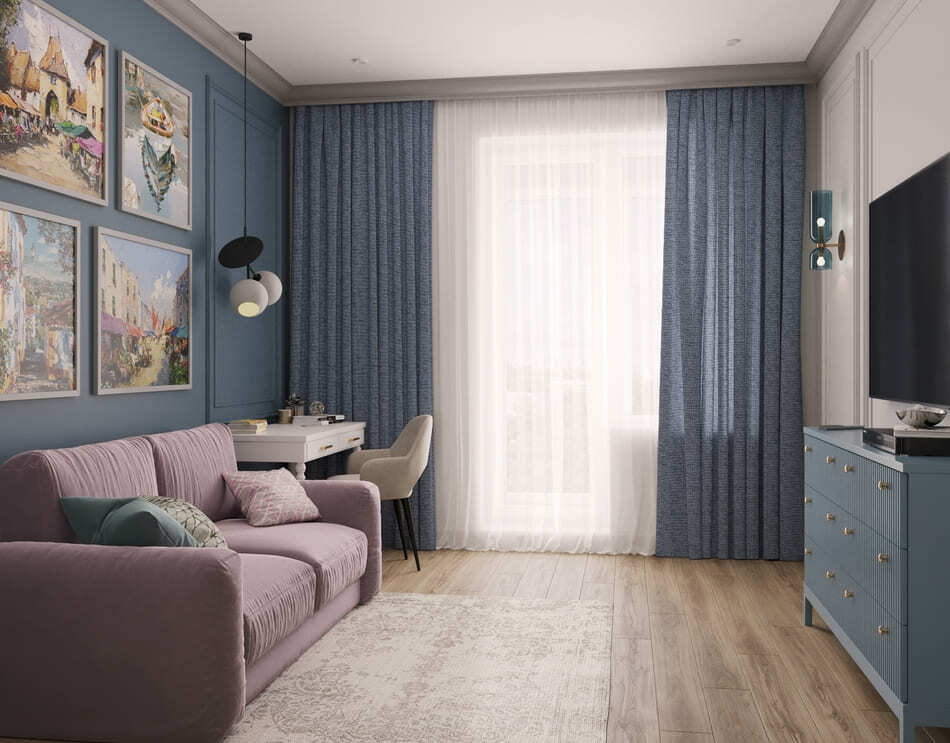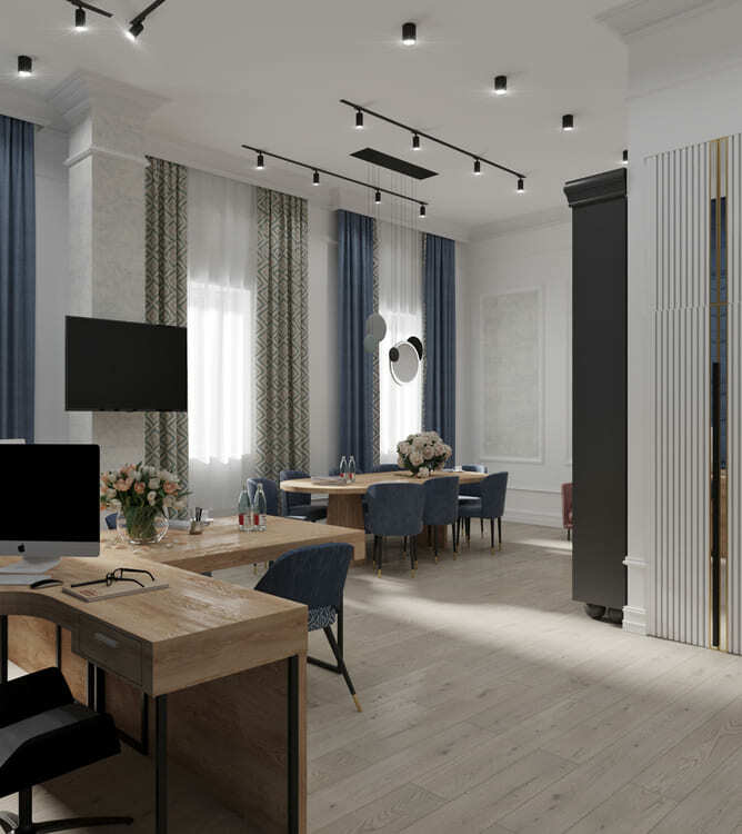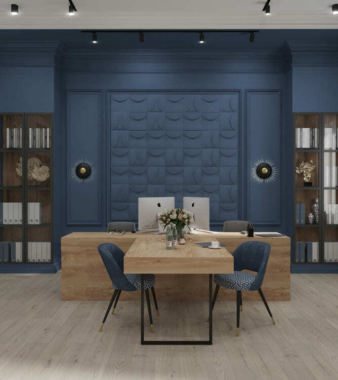 Наш заказчик — текстильная фабрика. Мы постарались по максимуму обыграть это в интерьере. Во-первых, синий цвет здесь акцентный не просто так. Синий — цвет логотипа компании. Во-вторых, основной герой интерьера — ткань. Здесь и 3D панели, которые своим узором напоминают драпированную ткань, и обои, которые мы подбирали так, чтобы они напоминали ткань по своей текстуре.