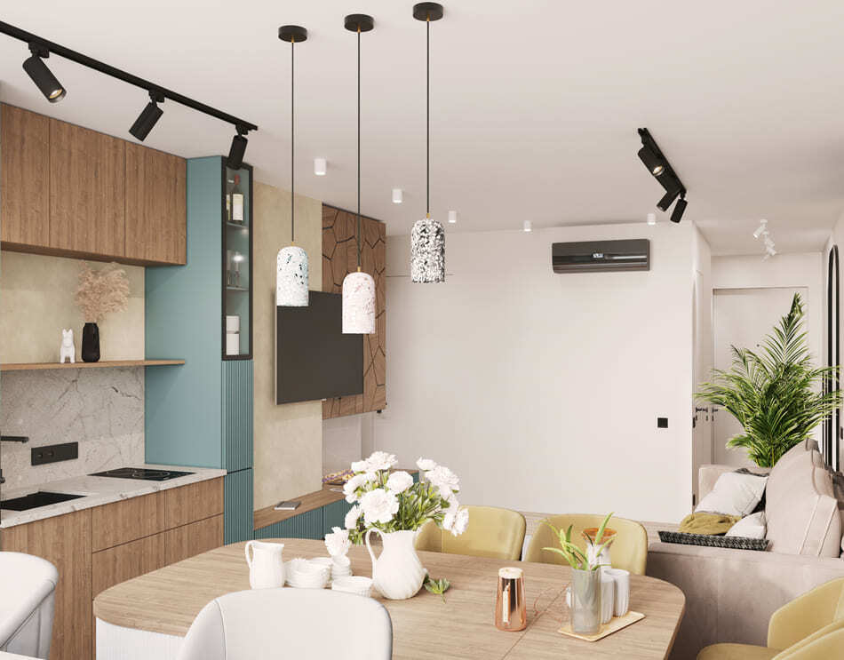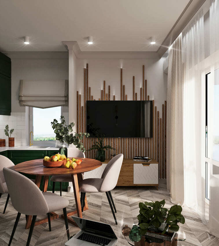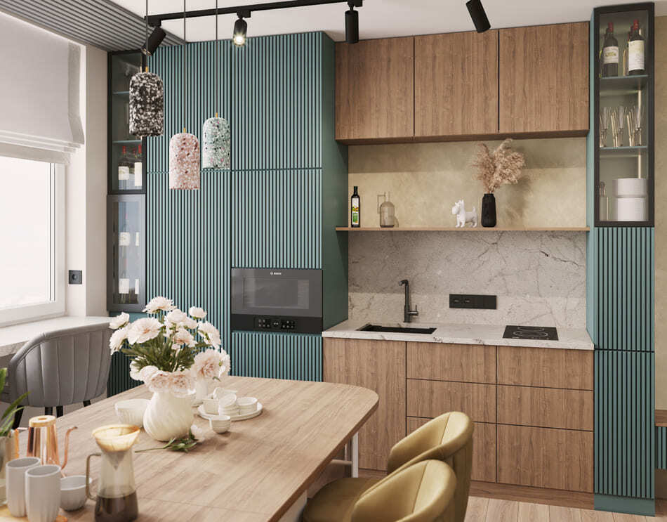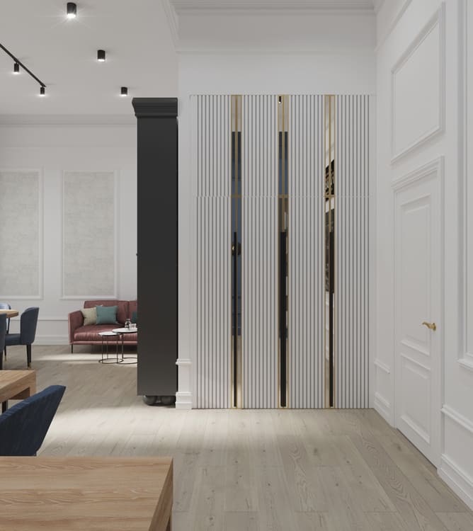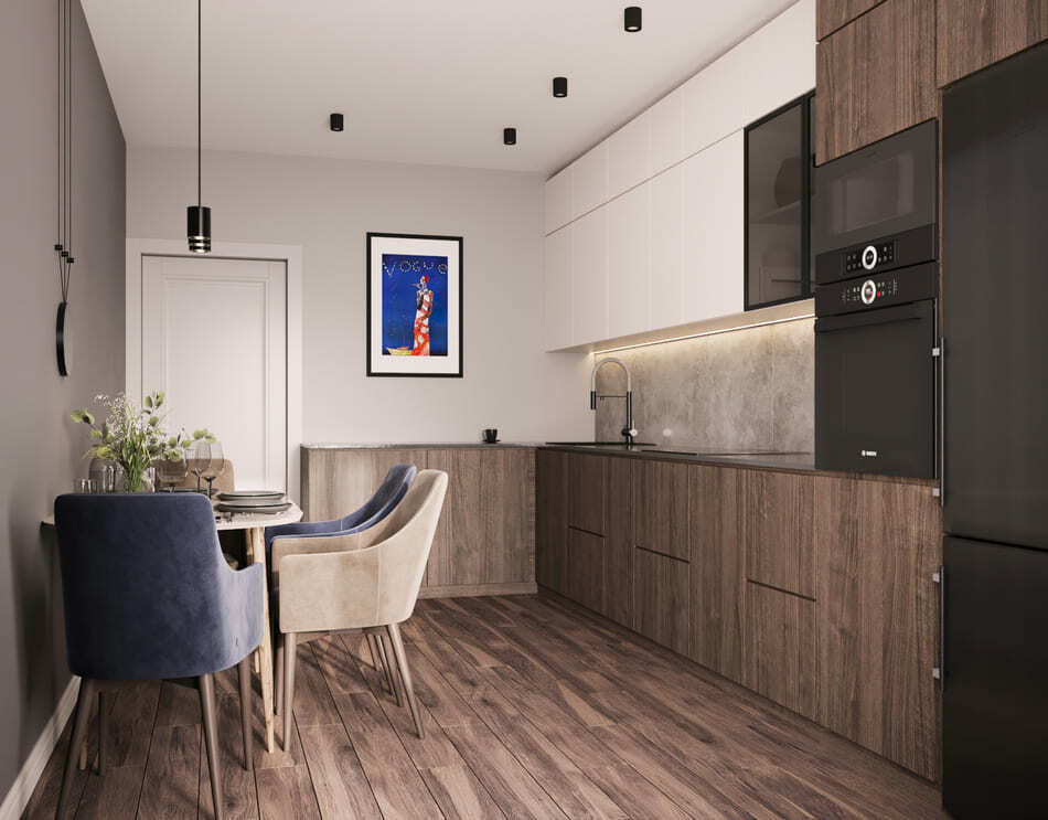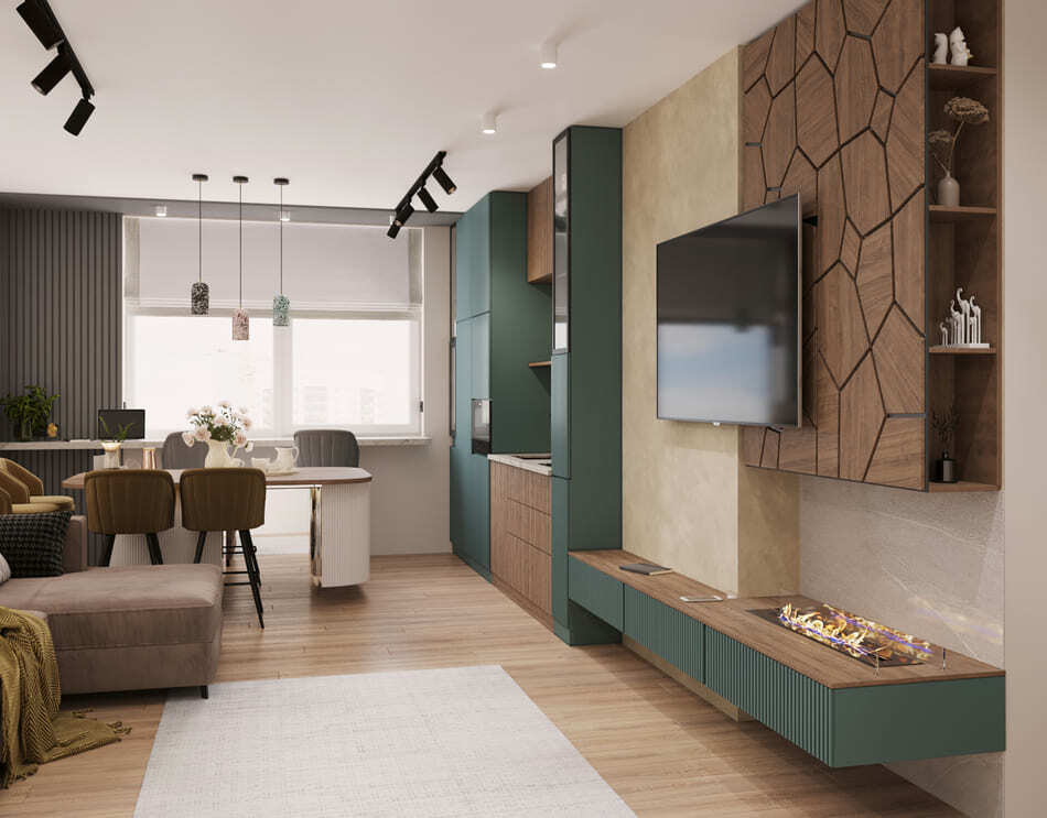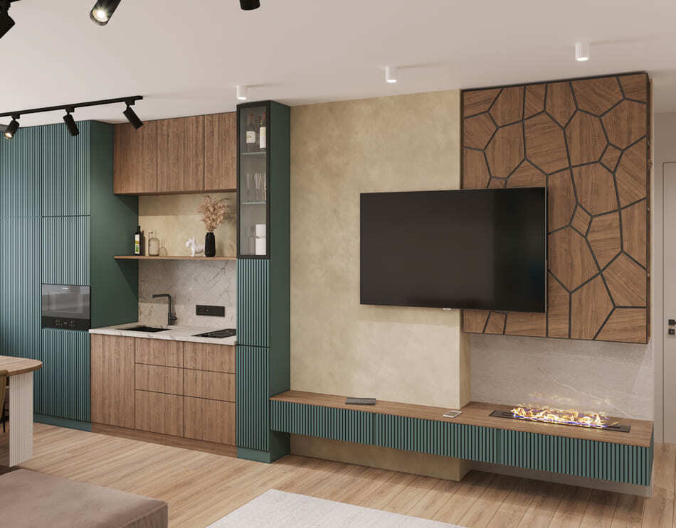 Кухня и гостиная объединены, при этом пожелание заказчика было таким, чтобы кухня была максимально красивой и маленькой. В гостиной части мы скрыли коммуникации деревянными панелями и идеально вписали камин.