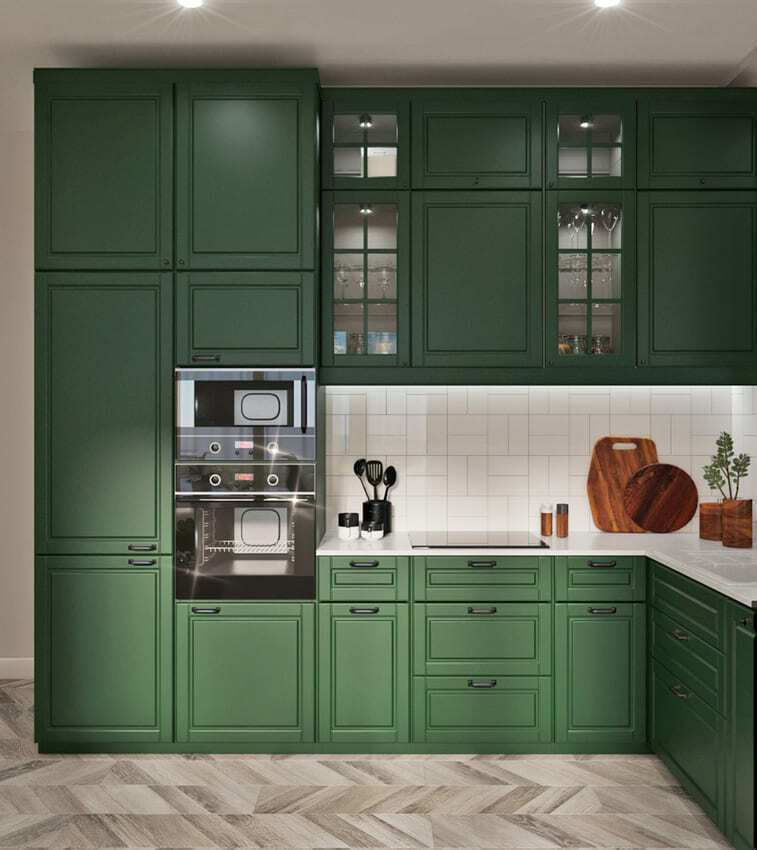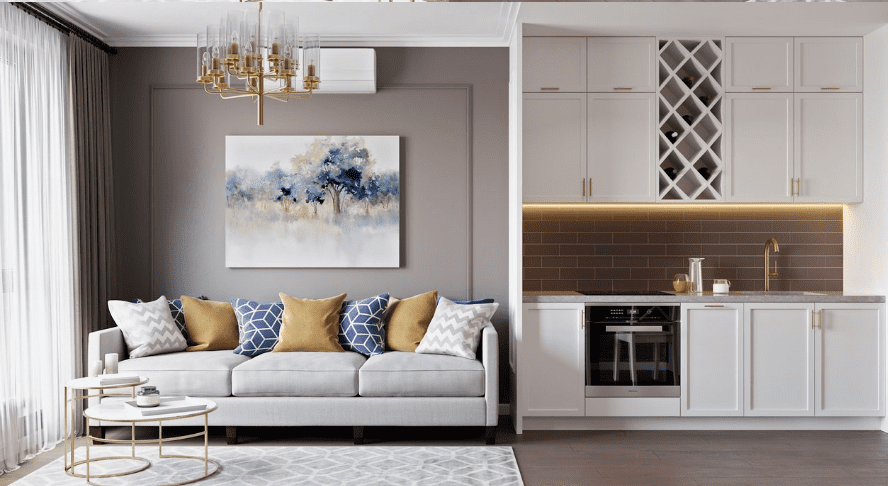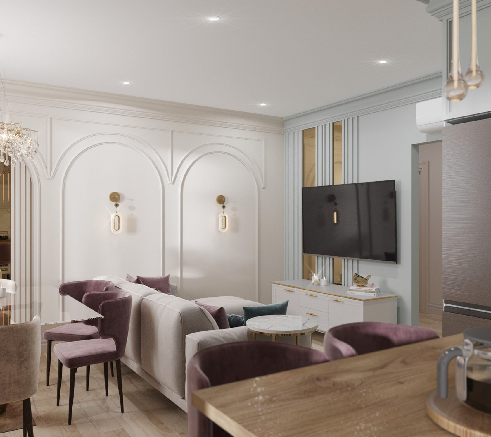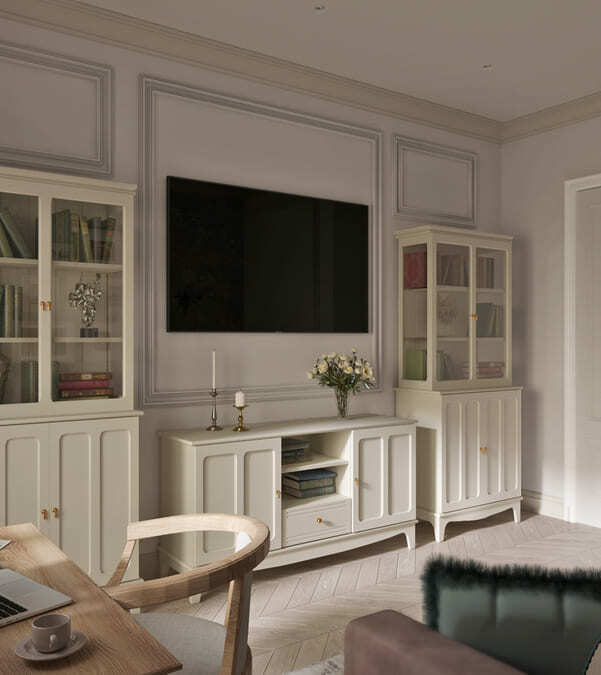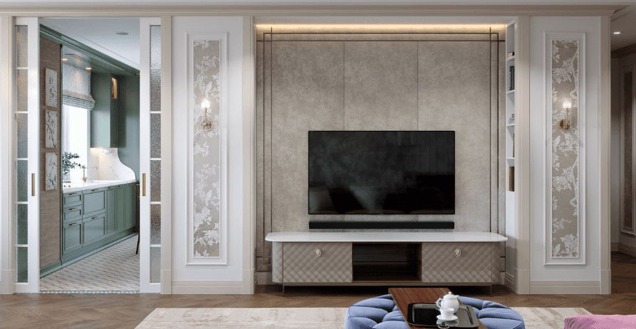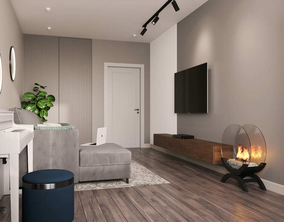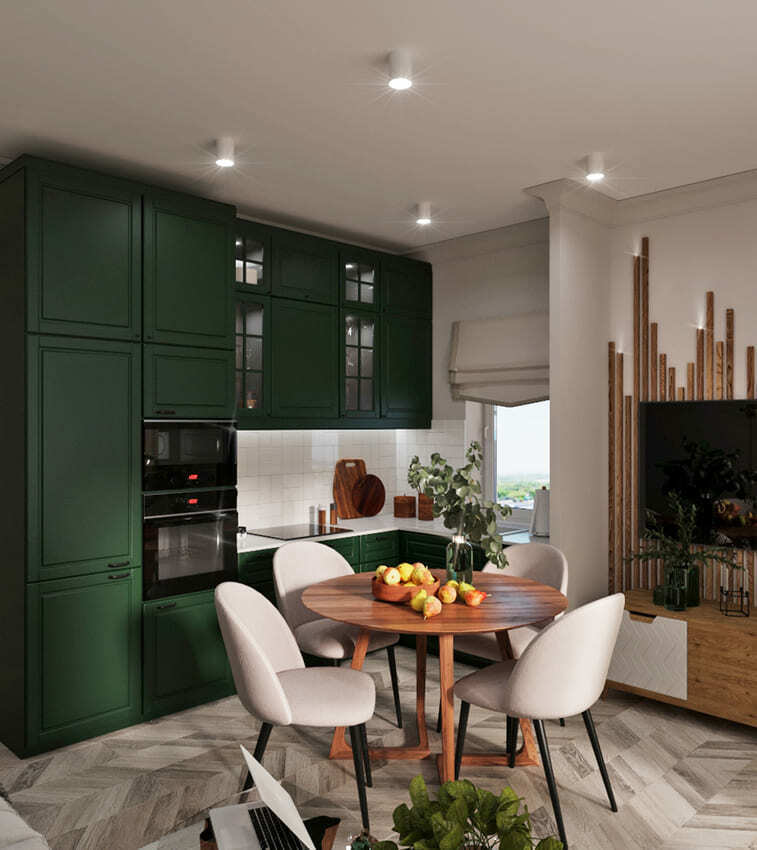 Кухня и гостиная объединены, при этом пожелание заказчика было таким, чтобы кухня была максимально красивой и маленькой. В гостиной части мы скрыли коммуникации деревянными панелями и идеально вписали камин.