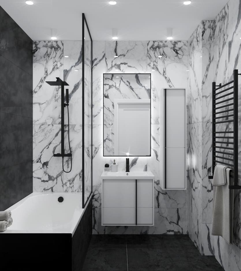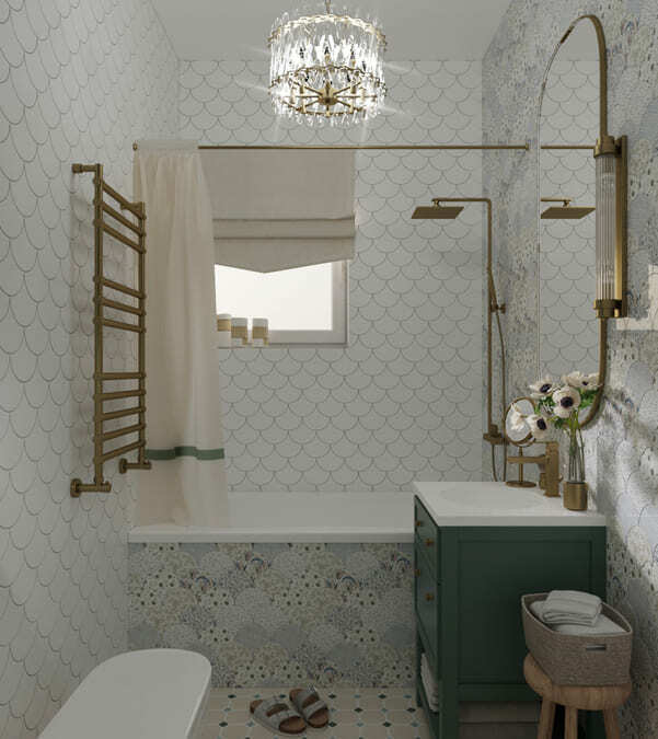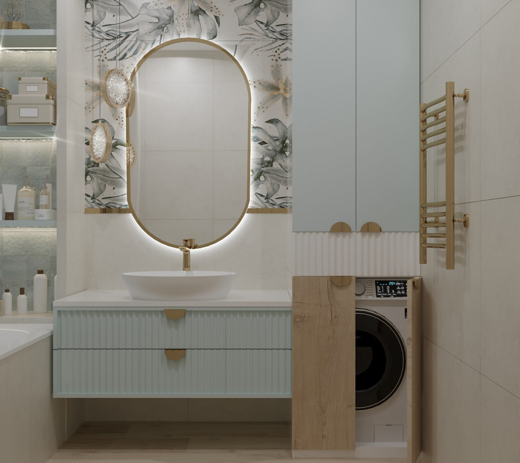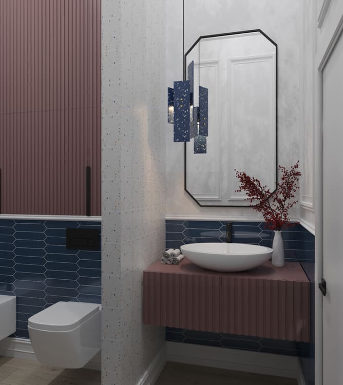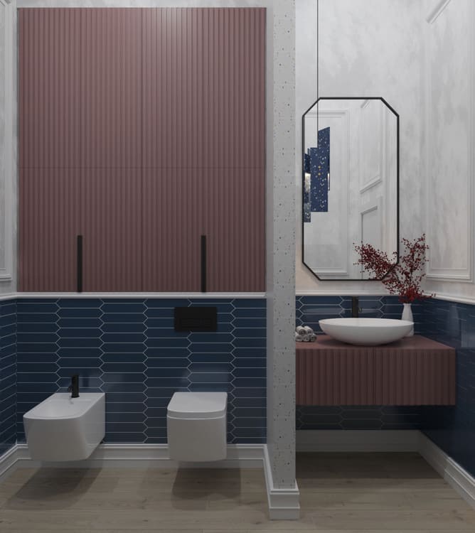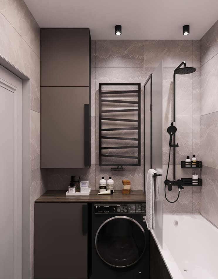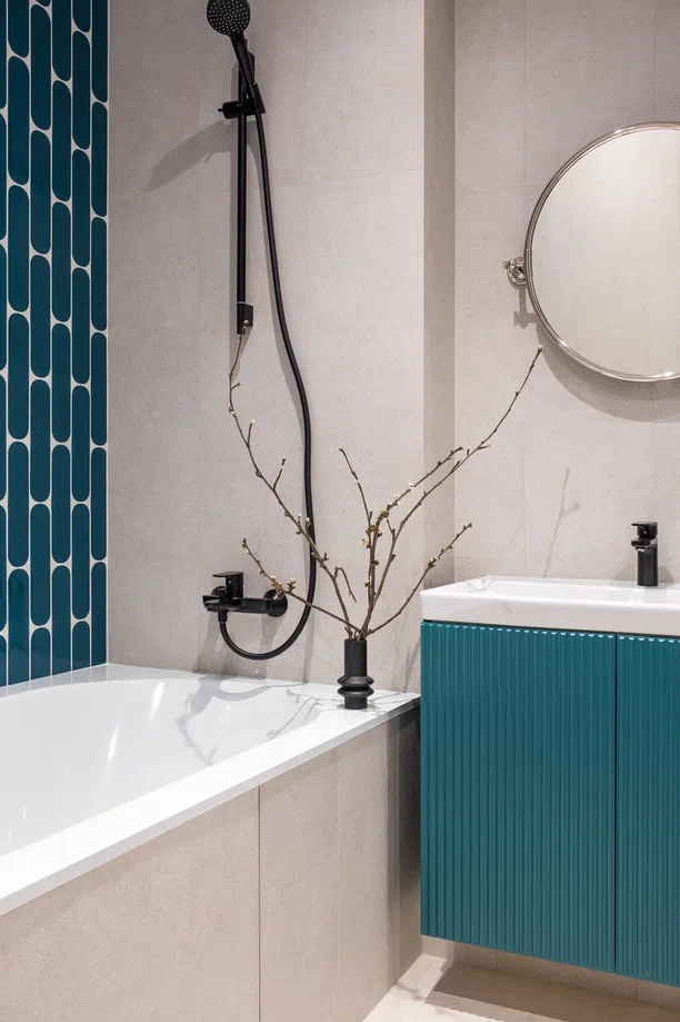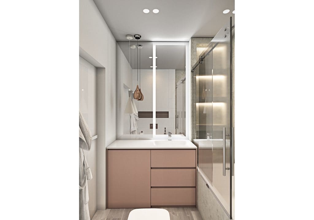 В этой квартире мы увеличили и разделили ванную комнату. Одну часть сделали для «релакса», вторую часть гостевую-бытовую, где расположили постирочную зону и скрыли необходимые коммуникации.