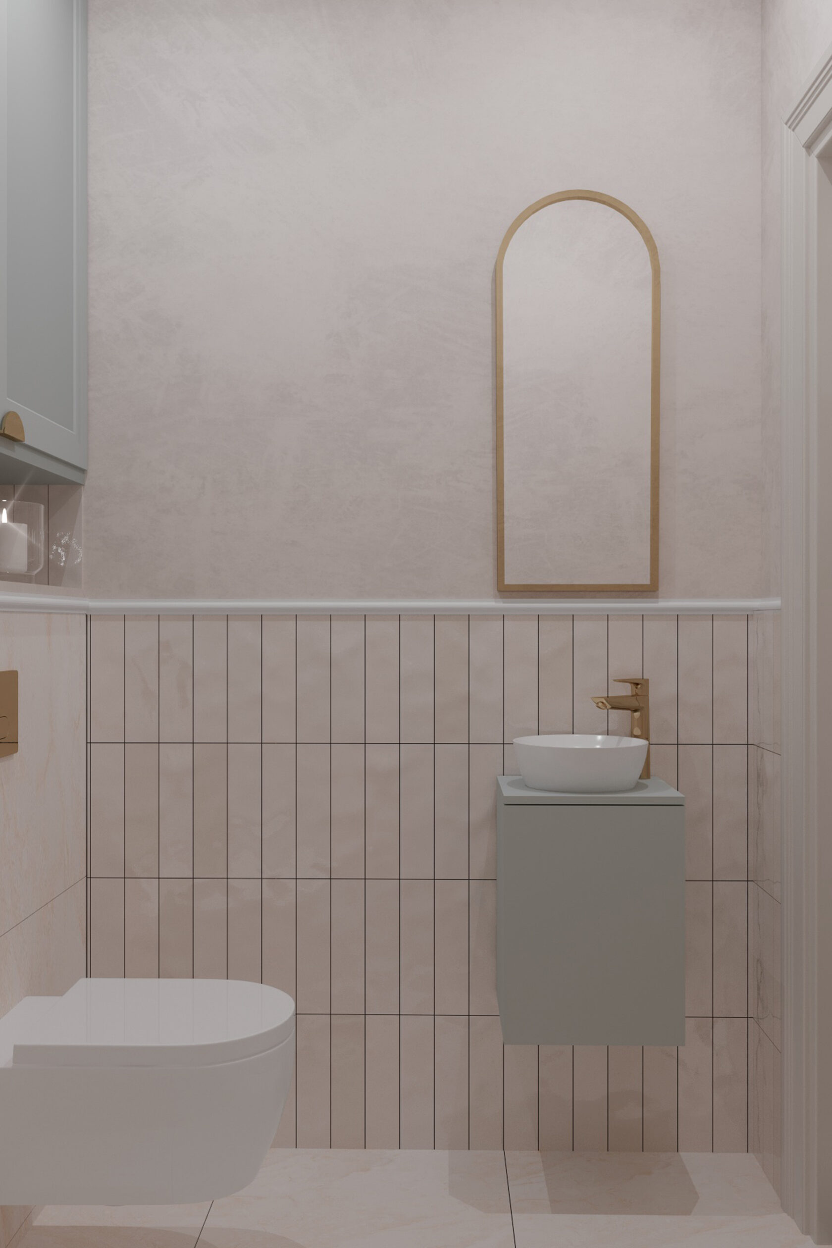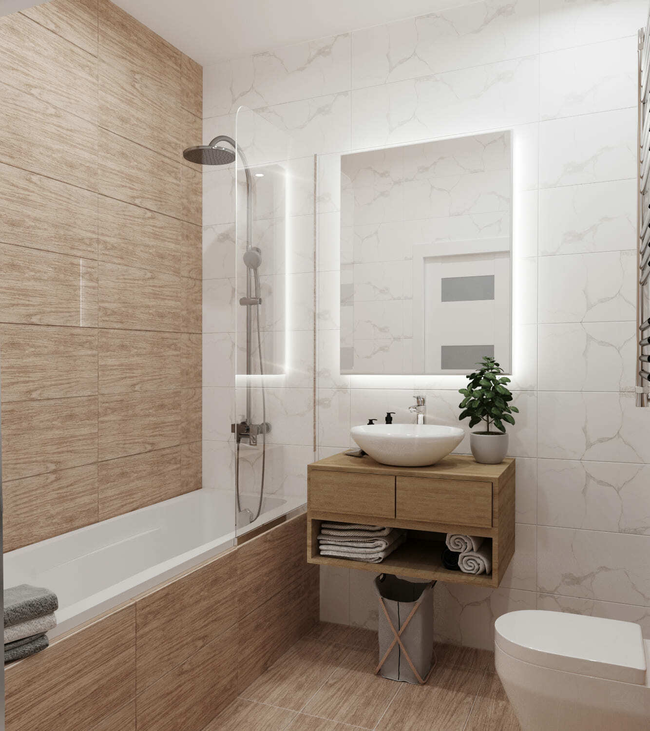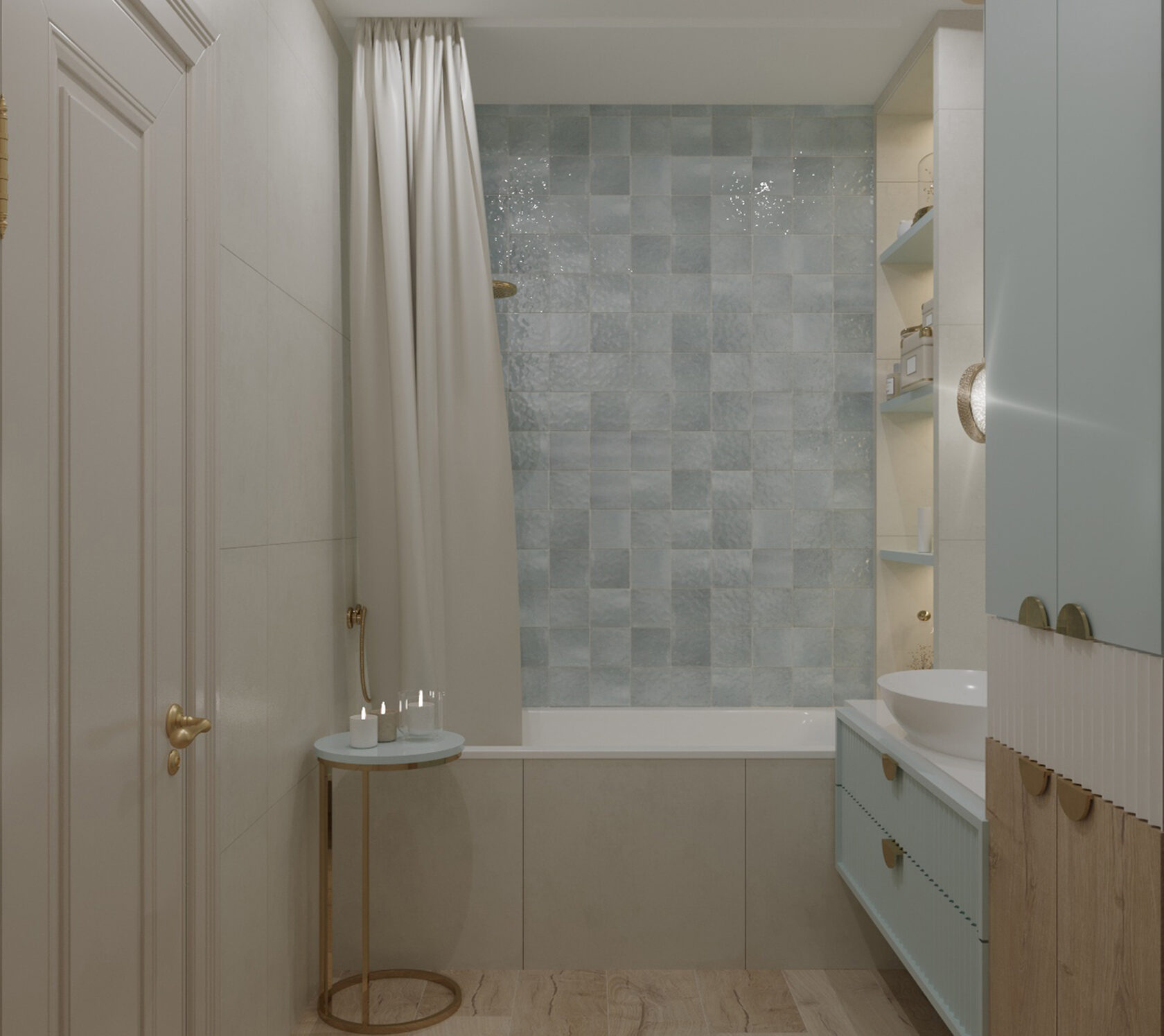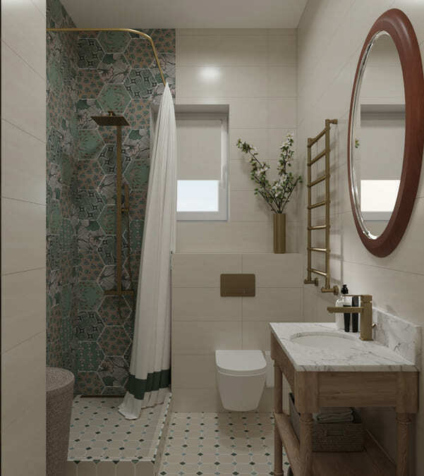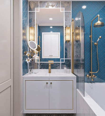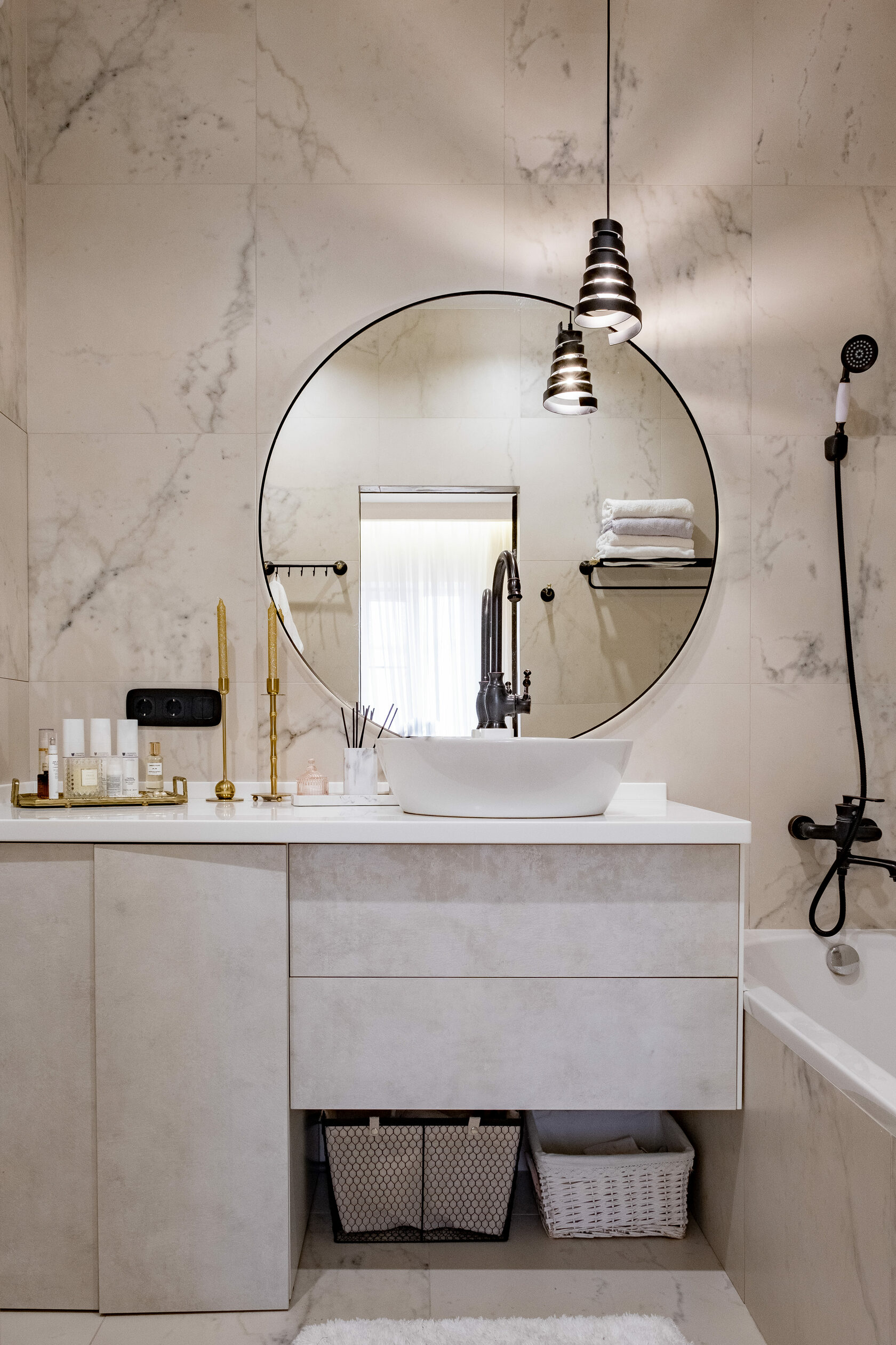 В этой квартире мы увеличили и разделили ванную комнату. Одну часть сделали для «релакса», вторую часть гостевую-бытовую, где расположили постирочную зону и скрыли необходимые коммуникации.