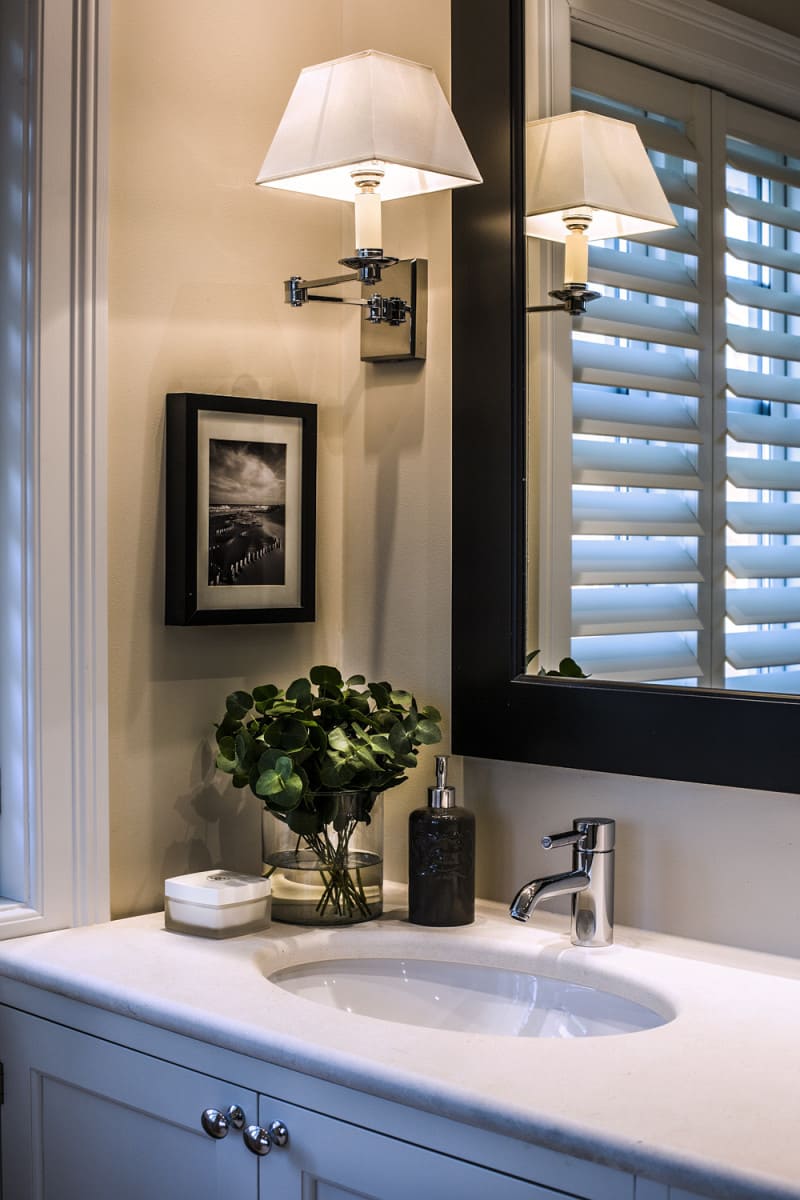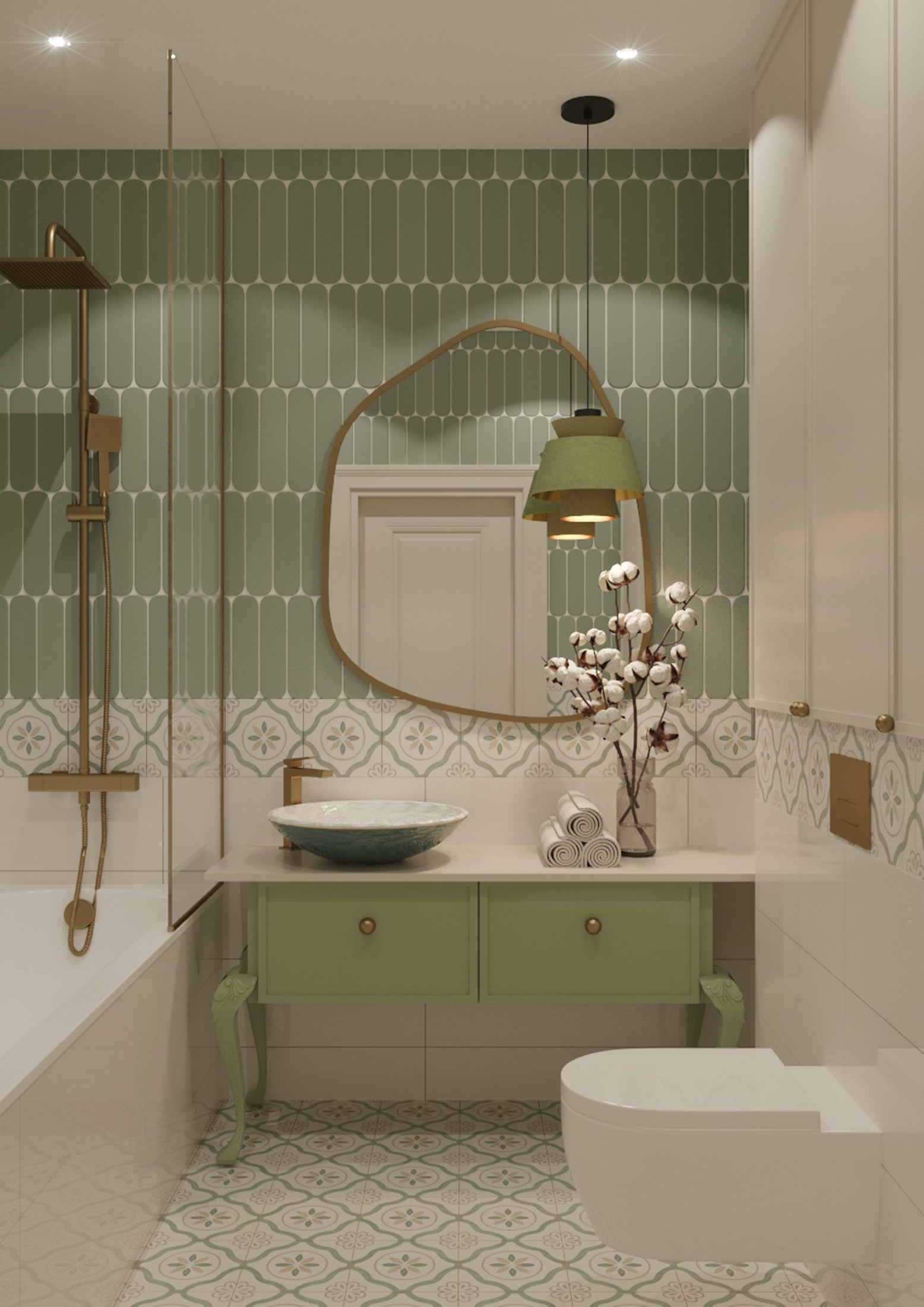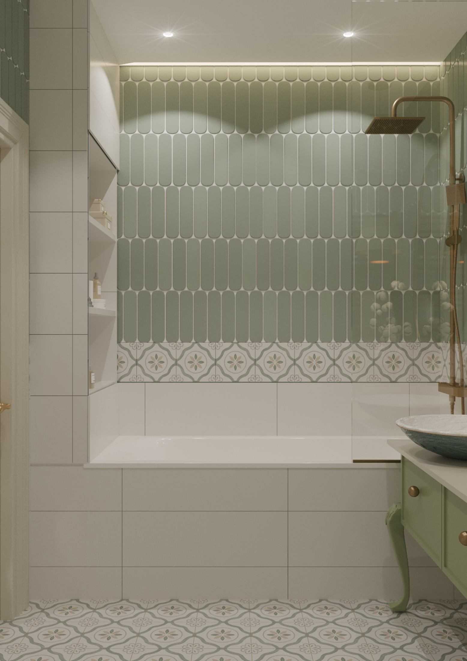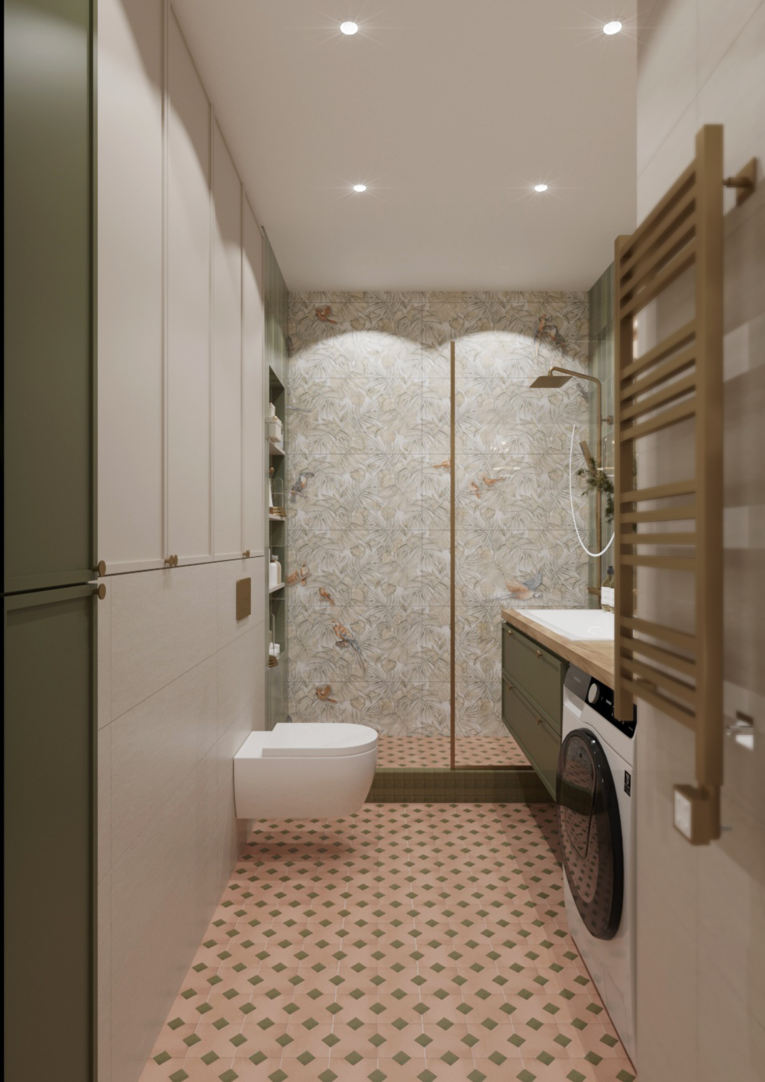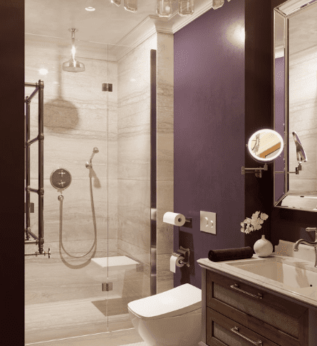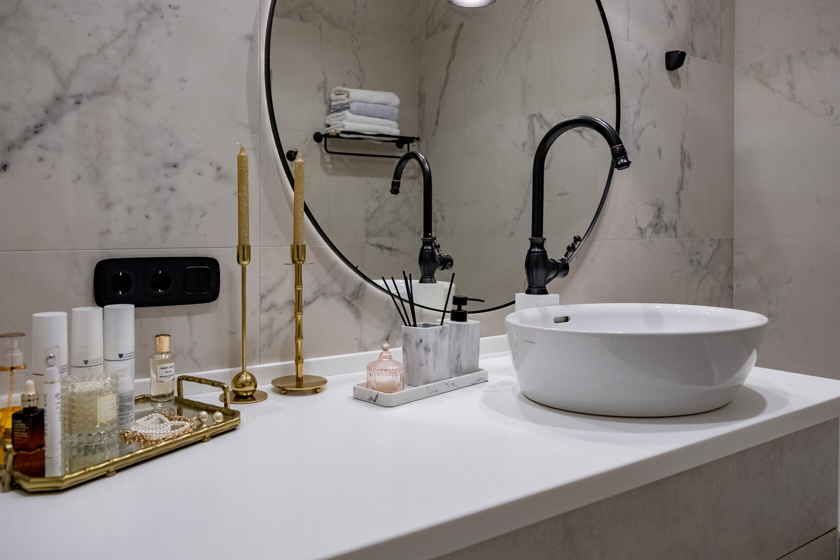 В этой квартире мы увеличили и разделили ванную комнату. Одну часть сделали для «релакса», вторую часть гостевую-бытовую, где расположили постирочную зону и скрыли необходимые коммуникации.