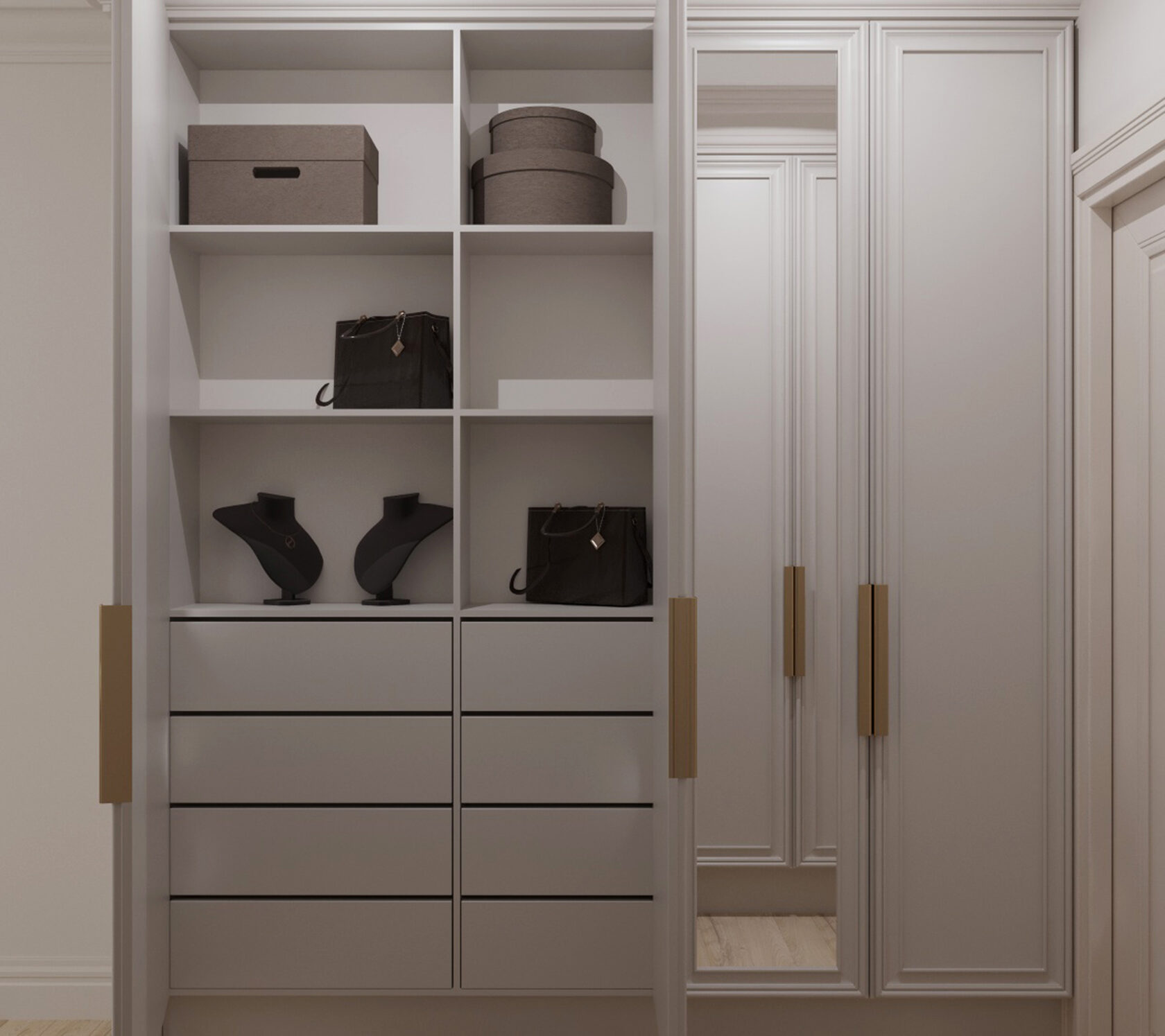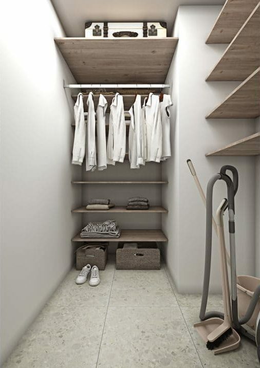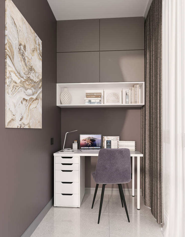 На кухне мы применили шкафы до самого потолка, в спальне выполненная на заказ кровать-подиум, которая также имеет потайные ящички. Все ниши задействованы под шкафы, куда можно все спрятать.