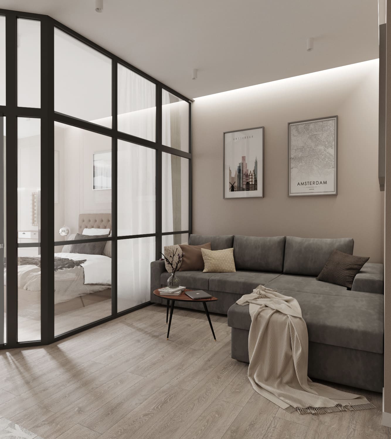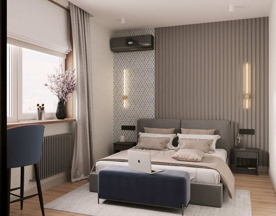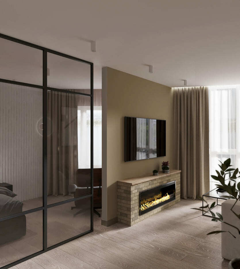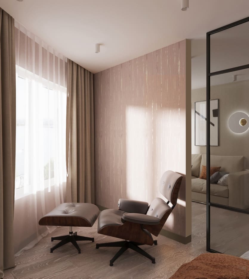 В небольшой квартире мы объединили лоджию с панорамными окнами с зоной спальни, отделив ее стеклянной перегородкой, что позволило сохранить легкость пространства, и в то же время разделить комнаты.