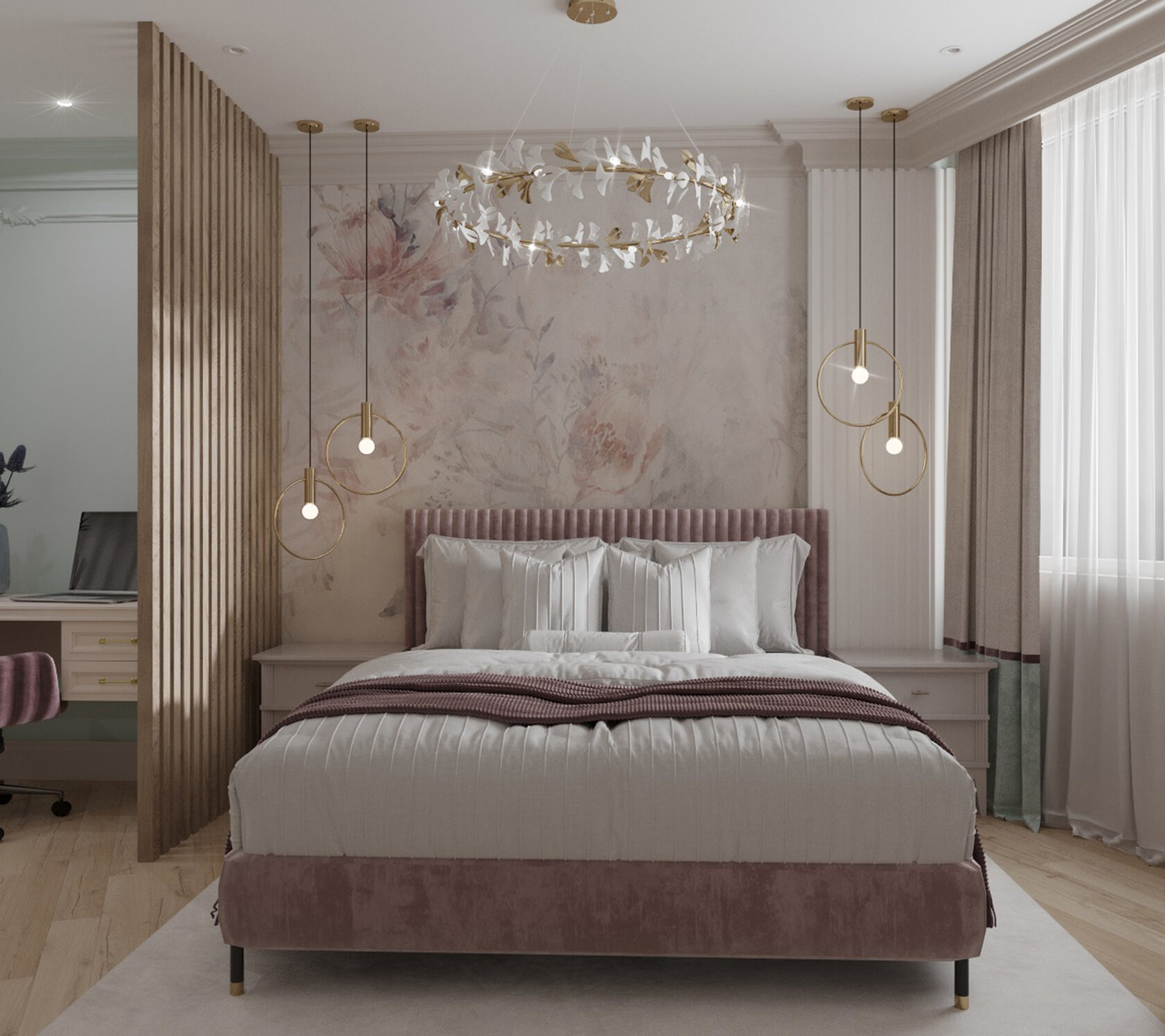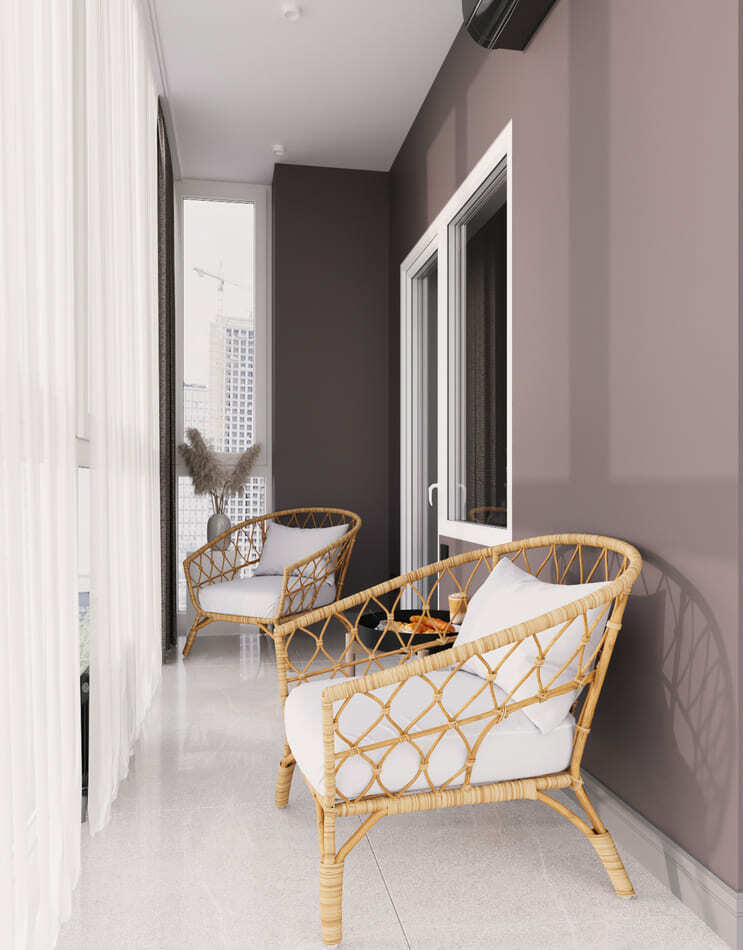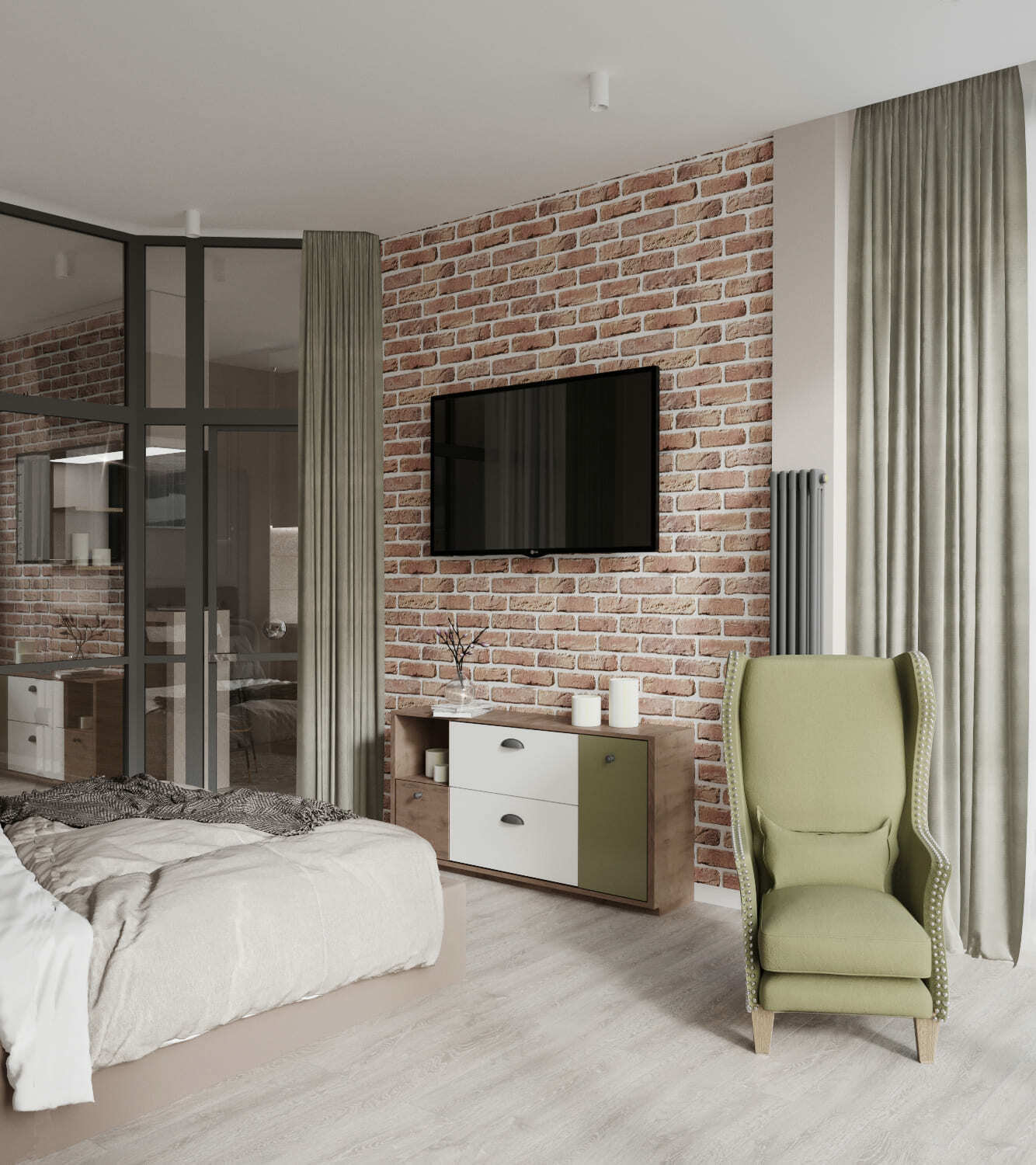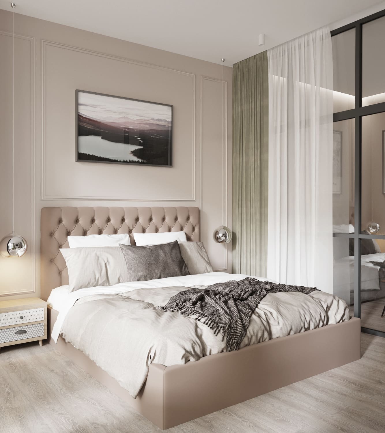 В небольшой квартире мы объединили лоджию с панорамными окнами с зоной спальни, отделив ее стеклянной перегородкой, что позволило сохранить легкость пространства, и в то же время разделить комнаты.