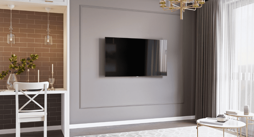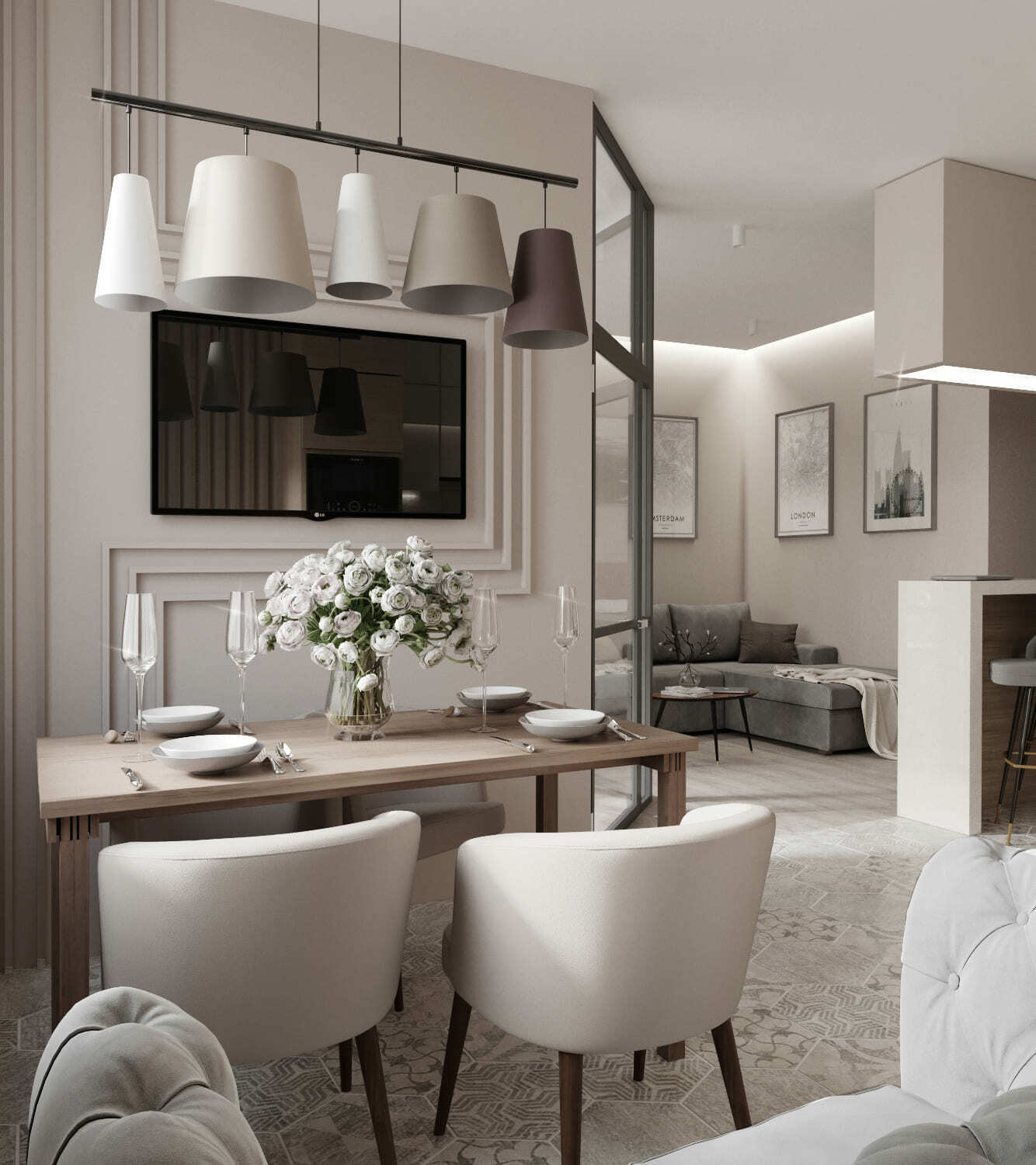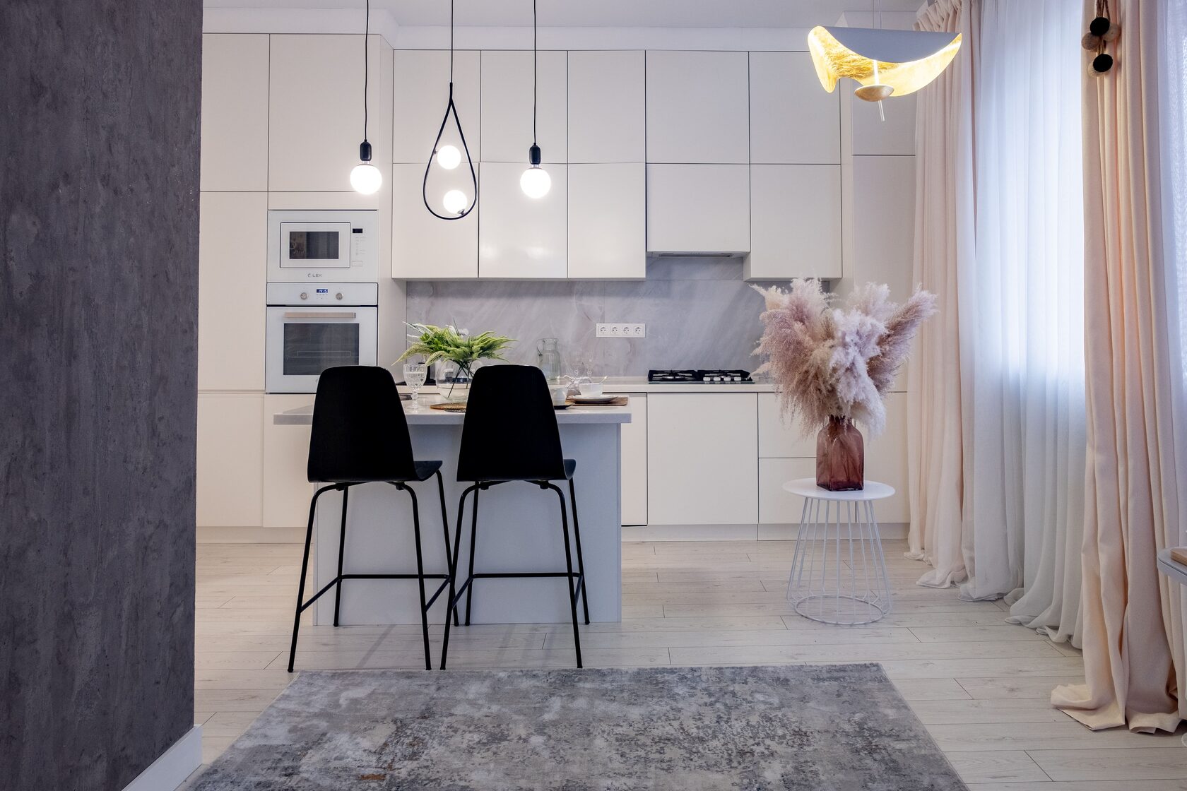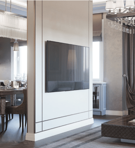 Благодаря высоким потолкам, более 3х метров, мы разделили гостиную с кухней барной стойкой и нависющей, «парящей» над ней конструкцией для ТВ. Такой ход позволил нам не городить сплошную стену и добавить функциональности.