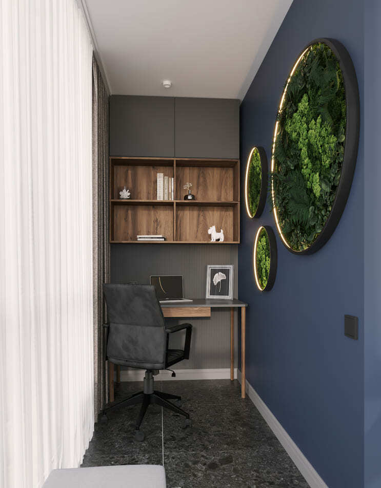 В квартире удобно расположились два кабинета на просторных лоджиях, большая детская комната с запасом на будущее (рождение второго малыша), спальня с гардеробной, максимально удобная кухня и уютная гостиная. Ванную и санузел было решено оставить раздельными для создания удобства — в санузле спрятались все необходимые коммуникации, фильтры и датчики протечки воды.