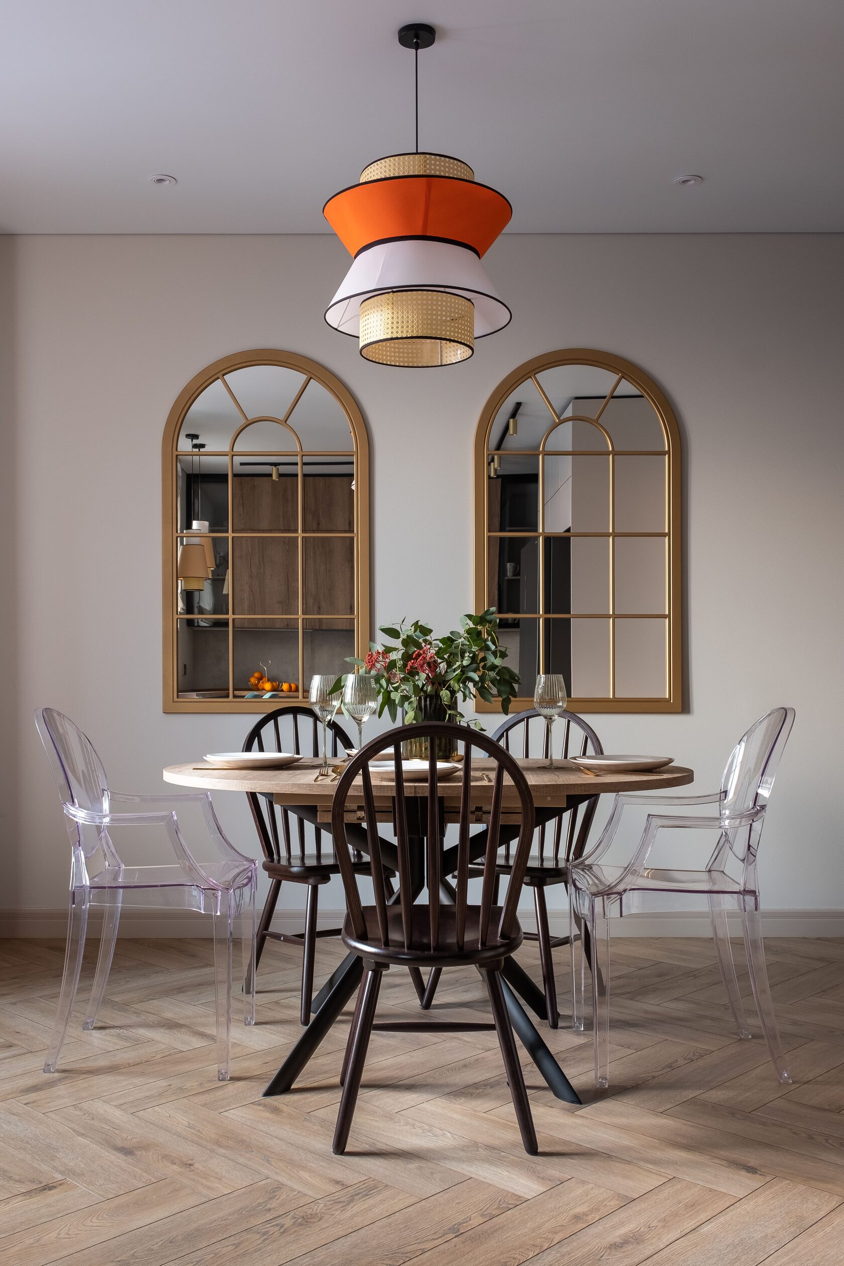 Небольшой уютный загородный домик. Заказчики хотели современный дизайн, но сохранить «прованский, деревенский дух». Цветочные принты, отреставрированные винтажные стулья, деревянные фактуры в сочетании с «дизайнерским» декором и абстрактными картинами, создают необычный и в то же время уютный и единый интерьер.